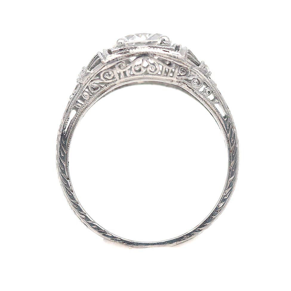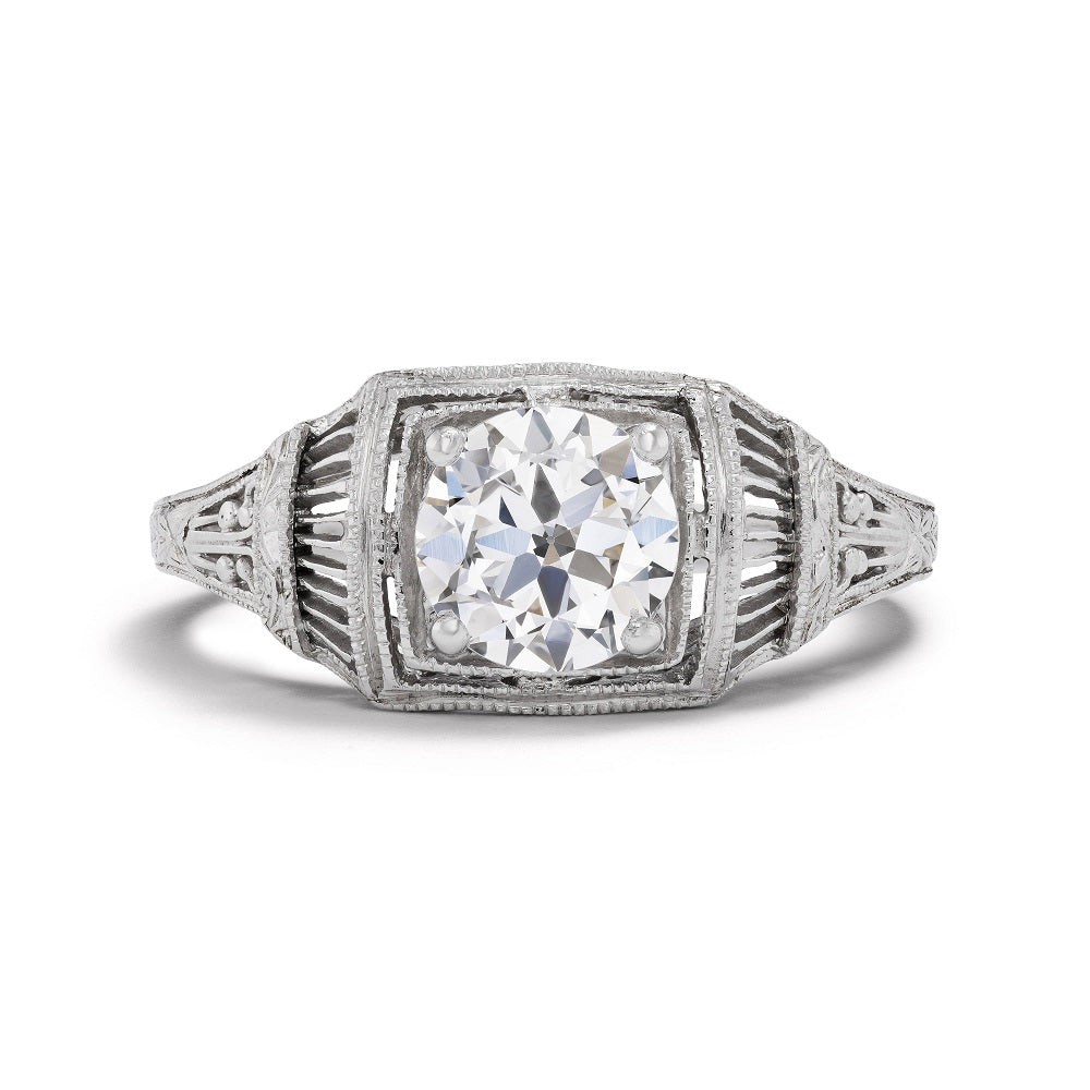 The Yamish ring is an authentic vintage diamond engagement ring from the Art Deco era circa 1920's. This intricate filigree diamond engagement ring features a GIA certified 1.00 old European cut diamond of E color, VS1 clarity, residing in a two tiered geometric milgrain frame. Beautifully crafted in platinum, accentuated with swirls of open metal work and and intricate filigree engravings. A rare, timeless jewel! In excellent condition.