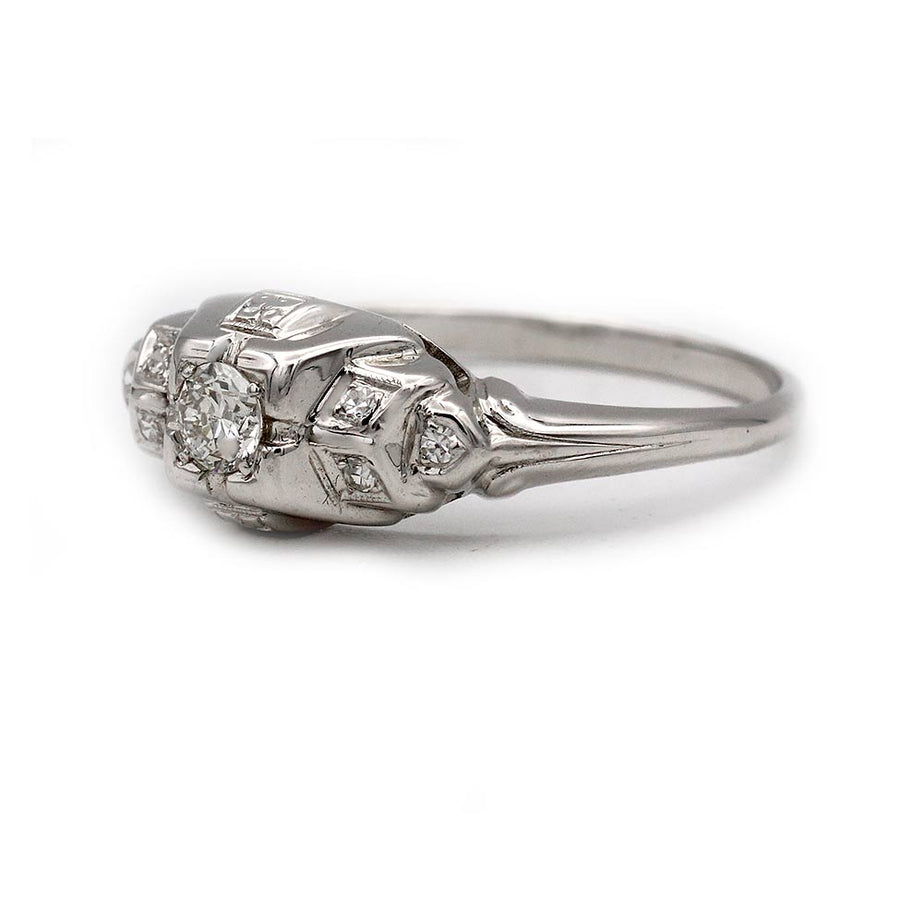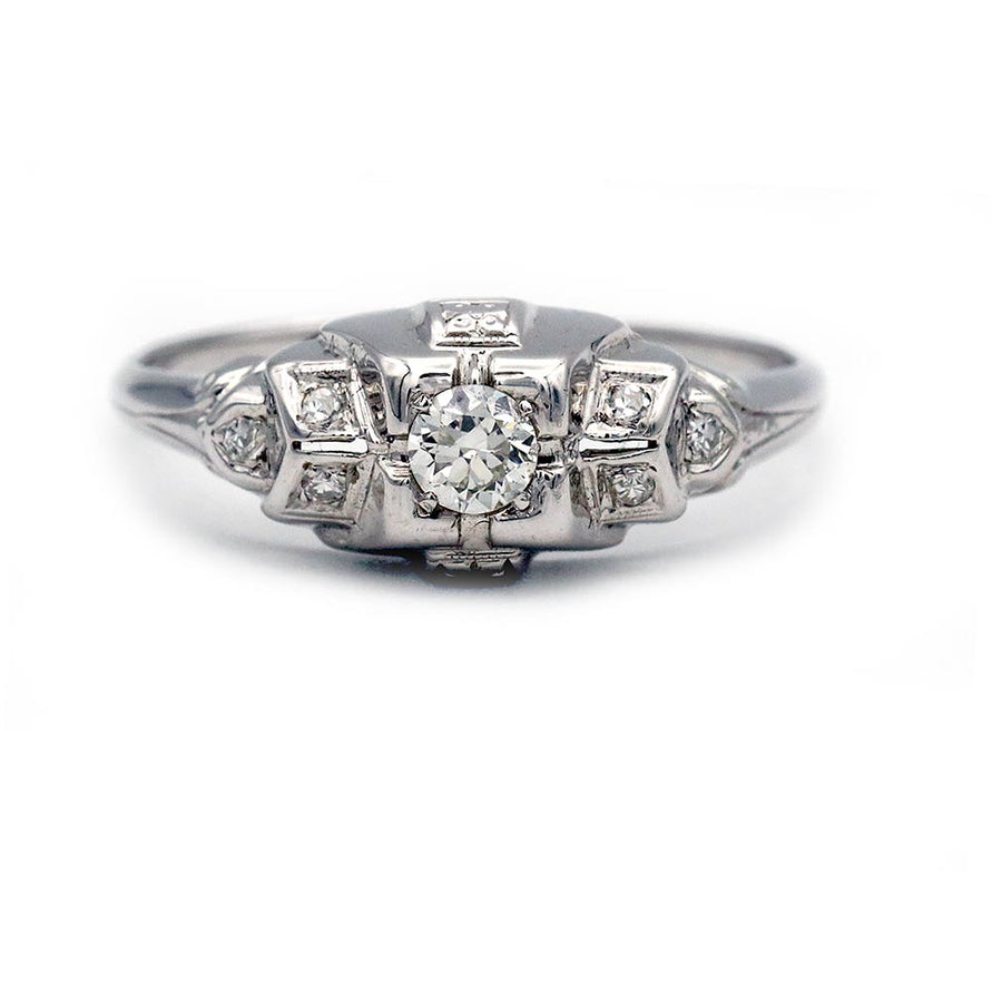 The Zen ring is a consummate Art Deco engagement ring, showcasing a .18 carat old European cut diamond flanked by eight (8) single cut diamond accents. This unique vintage ring boasts a geometric square frame, accentuated with milgrain engravings. Crafted in the 1930's in 14 kt white gold. Timeless, classic and in very good condition.