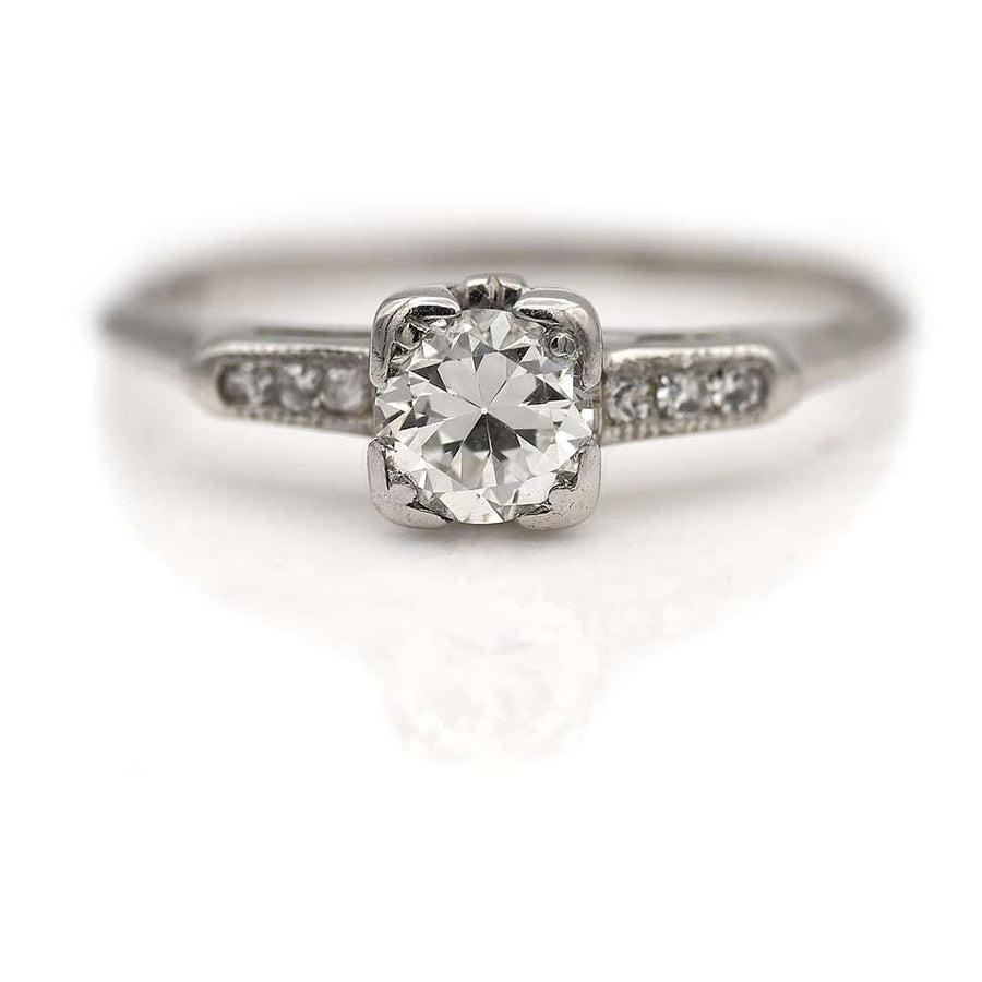 The Warren ring is an authentic vintage engagement ring, circa 1950s, featuring a glittering vintage .45 carat old mine cut diamond (I color and VS2 clarity), residing in a geometric square frame, and flanked by six (6) single cut diamond accents. Beautifully crafted in platinum. In good condition.