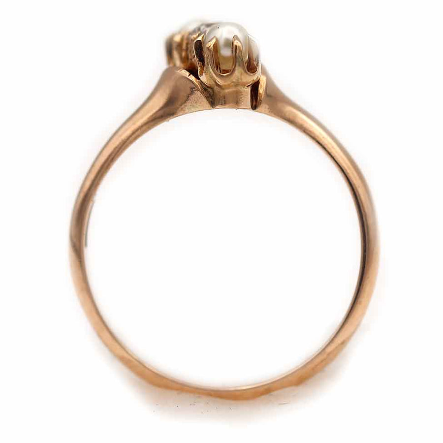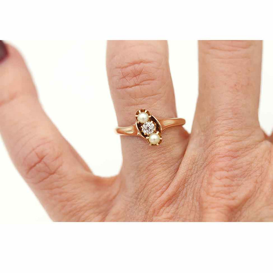 The Karrinn ring is an authentic vintage engagement ring from the Victorian era, circa 1900's. This ring features a prong set .15 carat old mine cut diamond of G color and SI1 clarity, surrounded by two (2) north-south seed pearls. Beautifully crafted in 10 kt rosy-yellow gold, this ring is as sweet and lovely as can be.