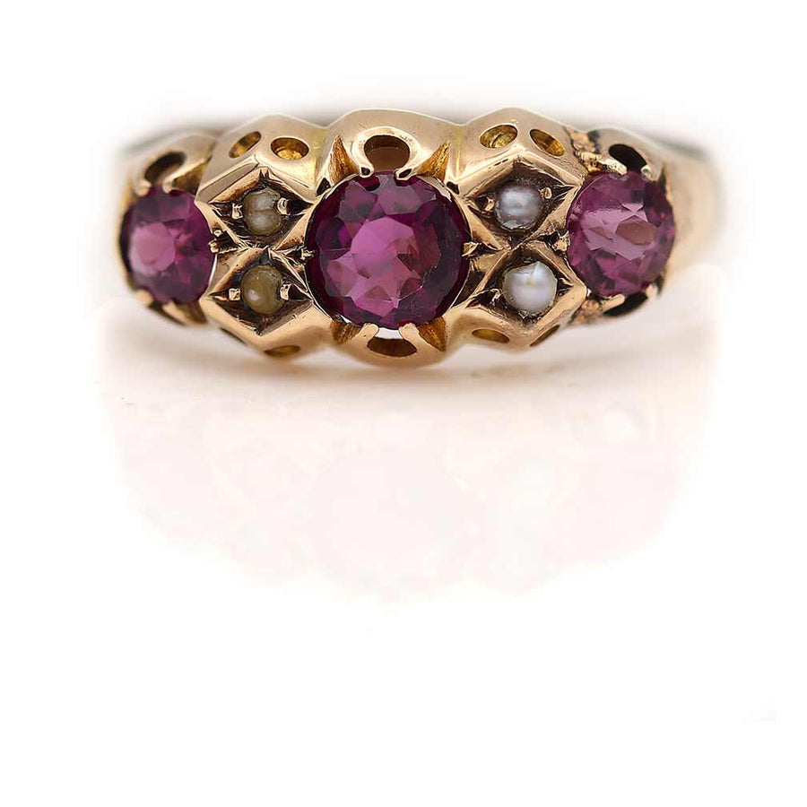 The Stein ring is an authentic Victorian engagement ring, circa 1900s, featuring three natural deep purple mine cut garnets weighing approximately .85 ctw and four (4) seed pearls. Beautifully crafted in 10 kt rosy gold, and accentuated with delicate filigree engravings, this is a sweet Victorian piece in very good condition. x-v1v0