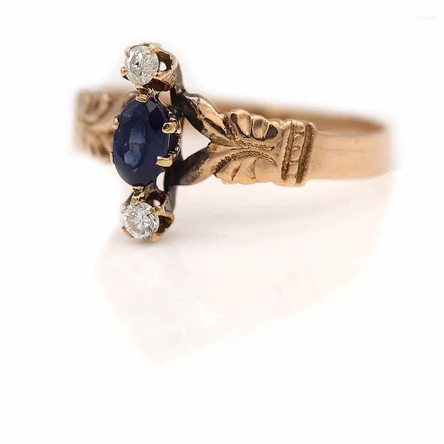 The Dennis ring is an authentic vintage engagement ring from the Victorian era, circa 1900s. This ring features a .30 carat natural vintage oval cut Ceylon sapphire, flanked by two (2) north-south old mine cut diamonds. Beautifully crafted in a 10 kt rosy-yellow gold setting, and accentuated with filigree engravings. A sweet Victorian sapphire ring, in very good condition.