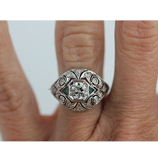 Edwardian 1.10 CTW Old European Cut Emerald Platinum Vintage Engagement Ring