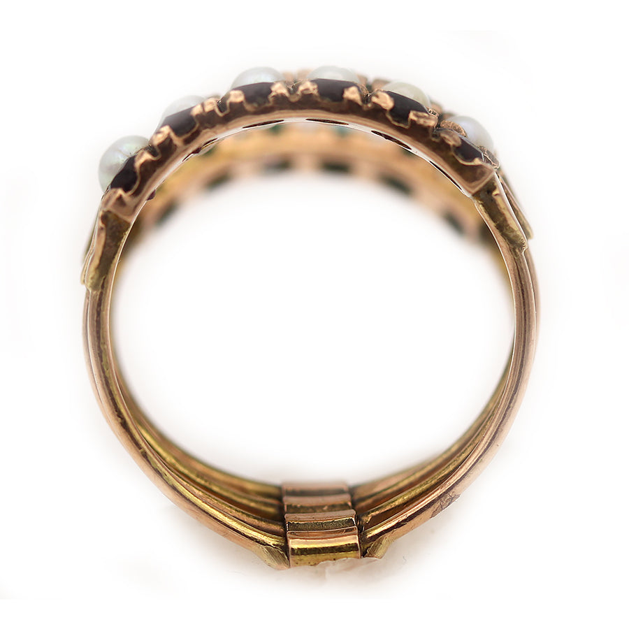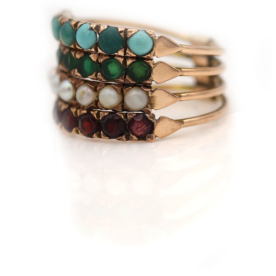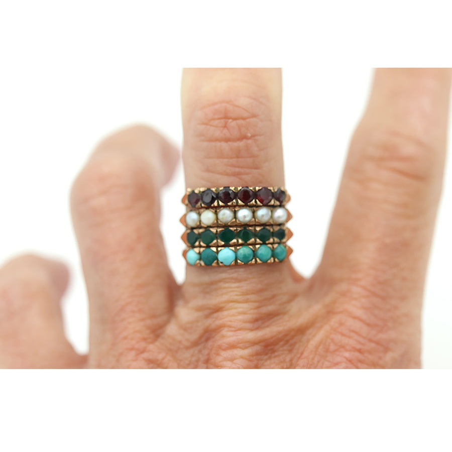 The Rain band is an original 1940's stacking band featuring natural round cut garnets, natural seed pearls, vintage synthetic round cut emeralds, and vintage cabochon turquoise. Superbly hand-crafted in 10 kt rosy yellow gold, this is a beautiful stacking band! Perfect to wear on either hand. Very hard to find!
