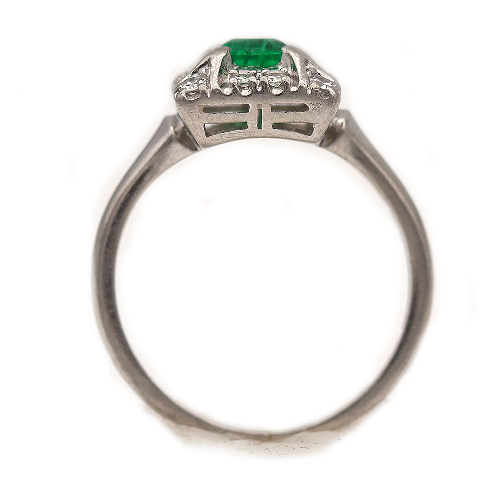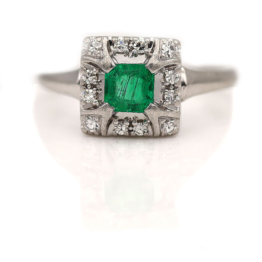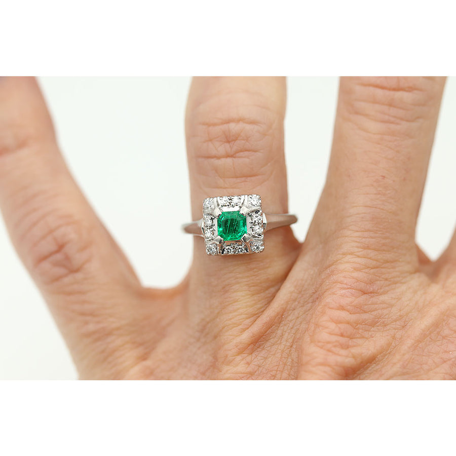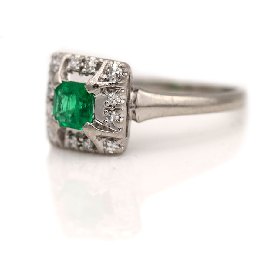 The Lunnea ring is an authentic vintage engagement ring circa 1970's. This vintage emerald and diamond halo engagement ring showcases a .50 carat natural Columbian square cut emerald. The emerald is surrounded by a delicate halo of 12 single cut diamond accents. Beautifully crafted in platinum, accentuated with a slightly tapered band. A lovely gemstone ring featuring a vibrant natural emerald. Perfect to wear on either hand. In very good condition.