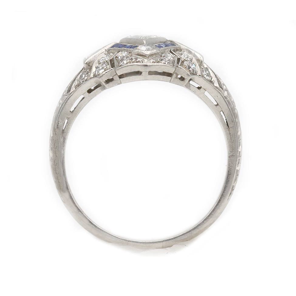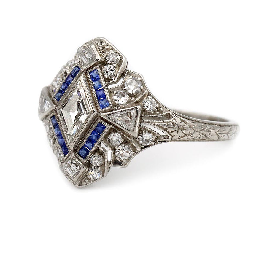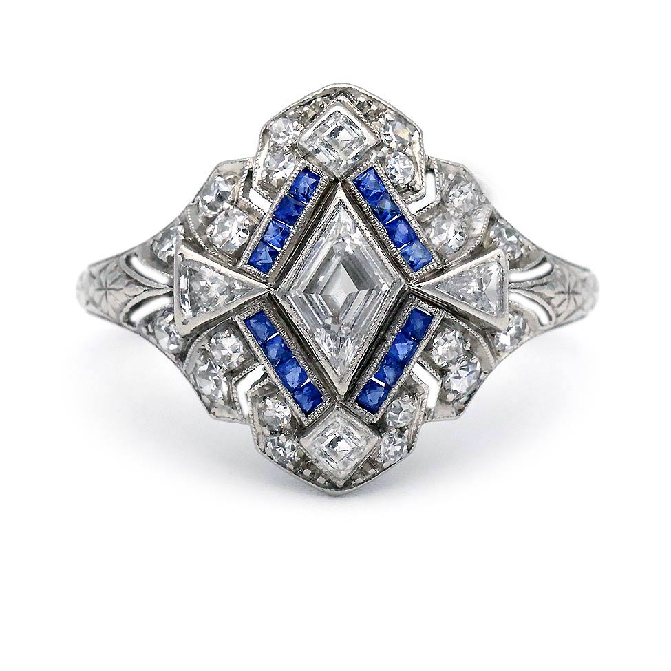 The Lensky ring is an authentic Art Deco vintage engagement ring from the 1930s. This original ring features a .40 carat antique bezel-set Chevron cut diamond, graded F color and VS2 clarity, flanked by 2 kite shape diamond accents. These diamonds are surrounded by 2 square cut diamonds, 16 square cut Burma sapphires, and 20 single cut diamond accents . Crafted in platinum and accentuated with elegant intricate milgrain, and delicate filigree engravings, this piece showcases the refined craftsmanship of the era. A crisp, beautifully detailed vintage treasure in very good condition.