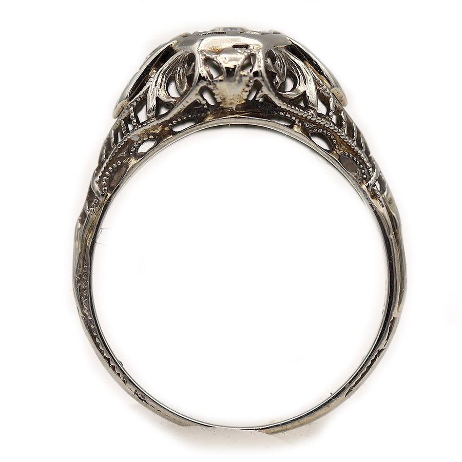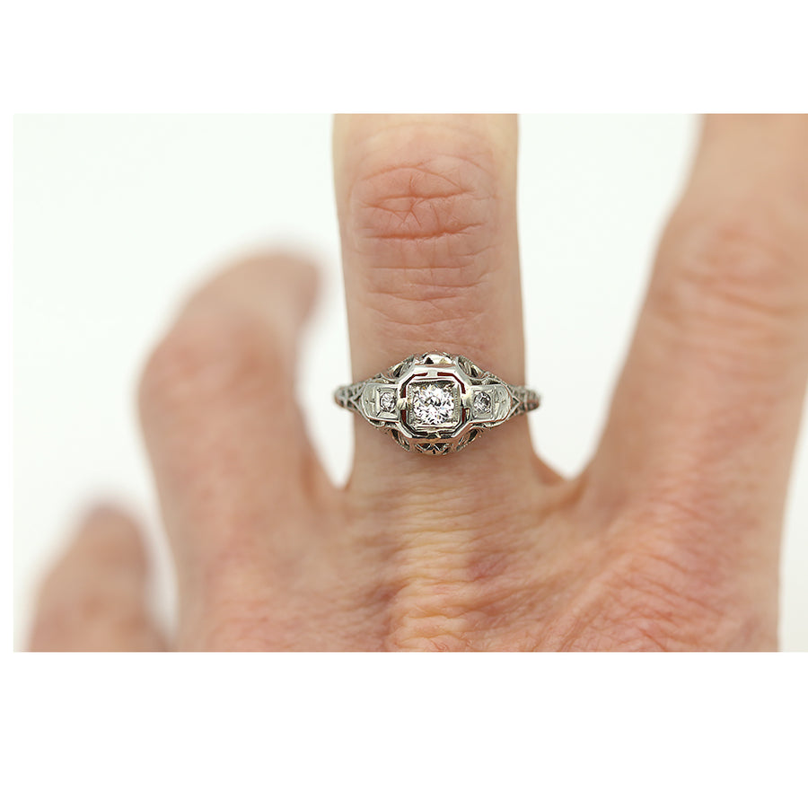 The Rosie C ring is an authentic vintage engagement ring from the Art Deco era, circa 1930's. This ring features a .25 carat old mine cut diamond of F color and VS2 clarity, residing in a geometric octagonal frame, flanked by two (2) single cut diamond accents. Beautifully crafted in 18 kt white gold and accentuated with swirls of metal work, delicate milgrain and filigree engravings, this is a lovely vintage piece. In very good condition.