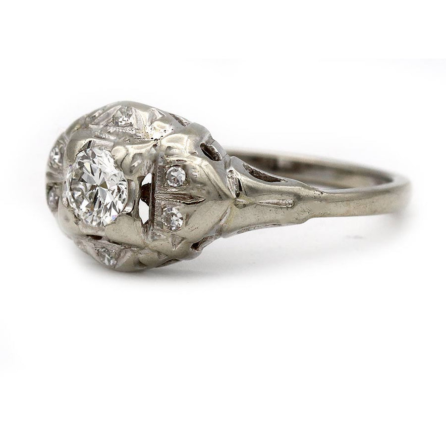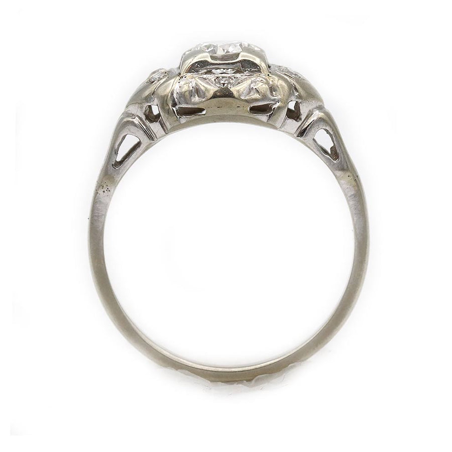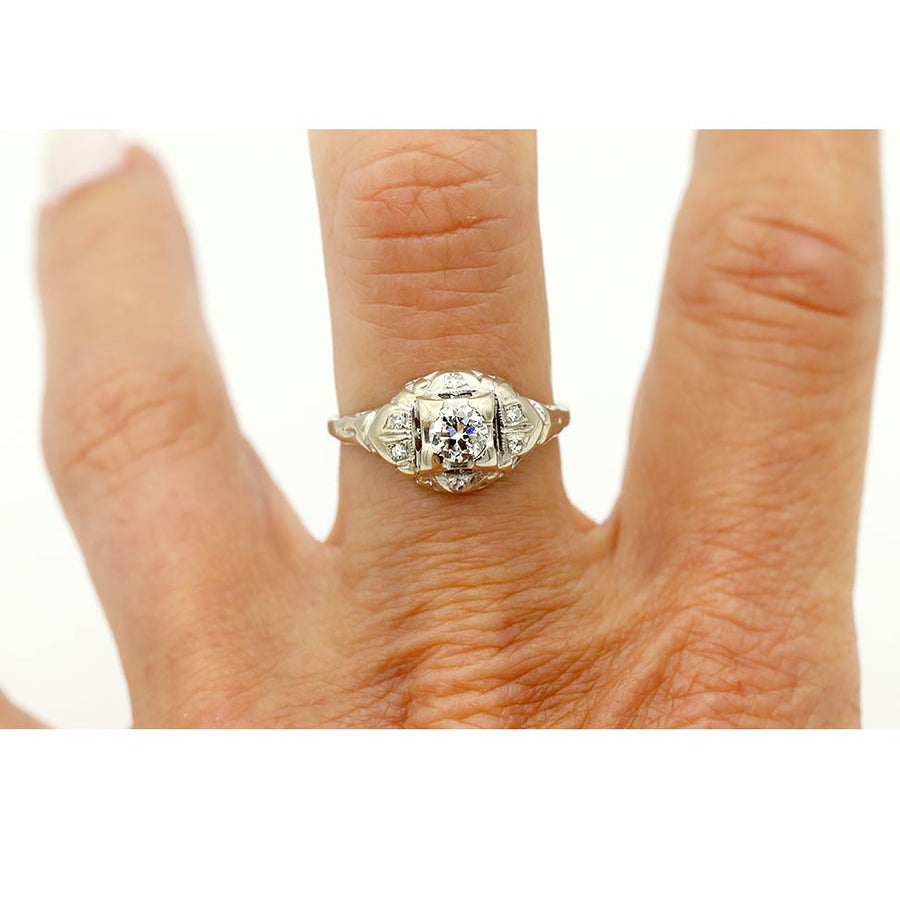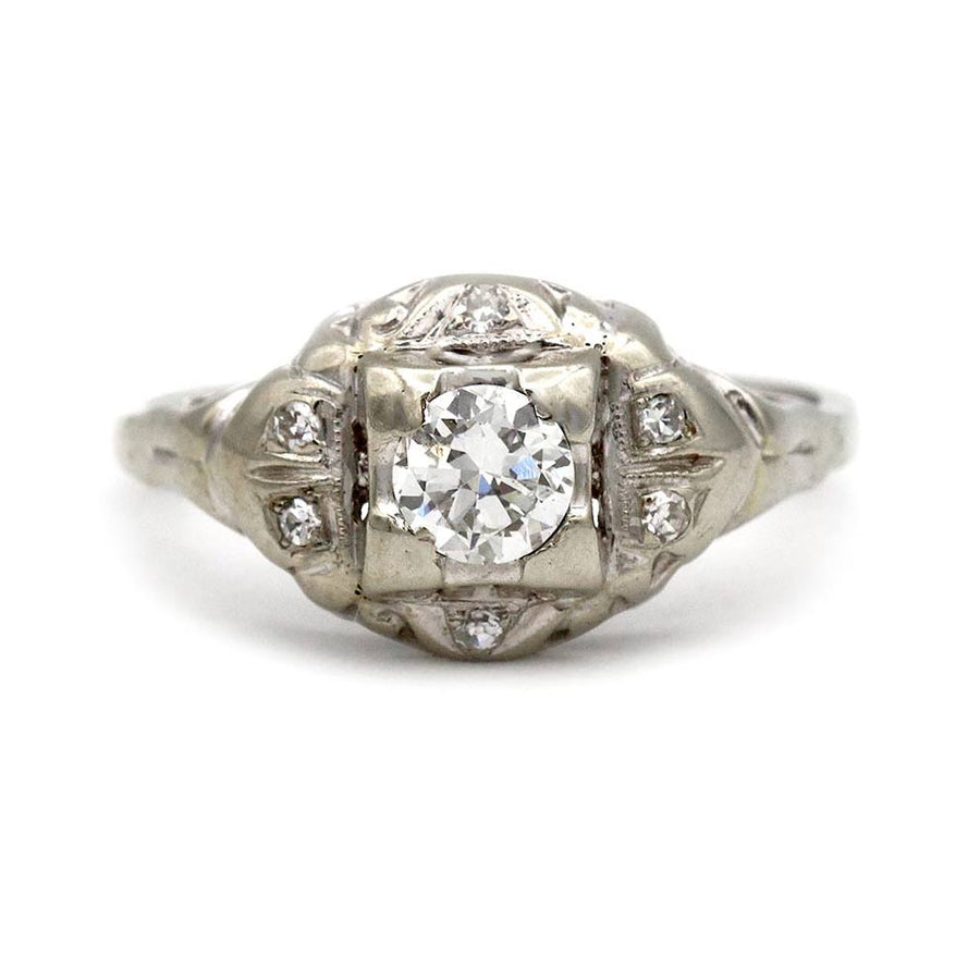The Skyler ring is an authentic vintage diamond engagement ring from the Art Deco era circa 1930s. The ring showcases a glittering .35 carat old European cut diamond of G color, SI1 clarity, residing in a geometric square frame. The diamond is surrounded by 6 single cut diamond accents. Crafted in 18 karat white gold, completed with milgrain engravings. A classic 1930's engagement ring. In good condition.