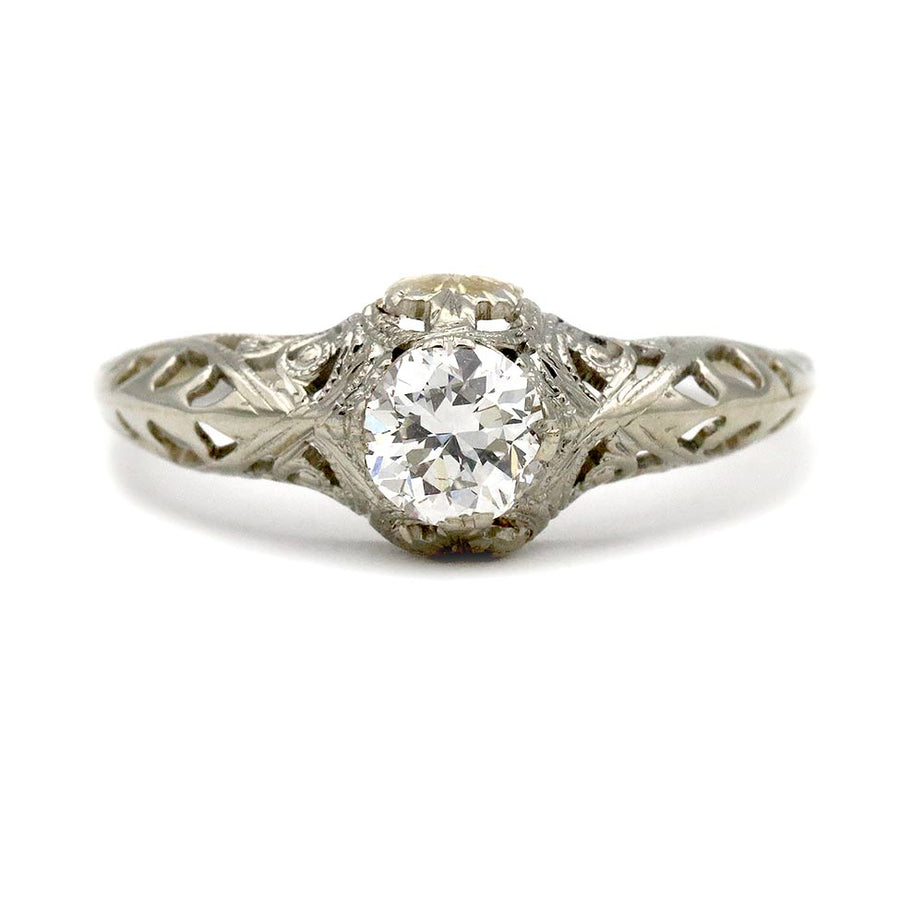 The Caron ring is an authentic vintage engagement ring from the Art Deco era circa 1930s. The ring features a GIA certified .51 carat old European cut diamond of J color, VS2 clarity. The diamond stands tall and proud in a hand crafted 18 karat white gold setting, accentuated with open metal work and beautiful filigree engravings. A classic Art Deco beauty, with a vibrant antique diamond. In very good condition.