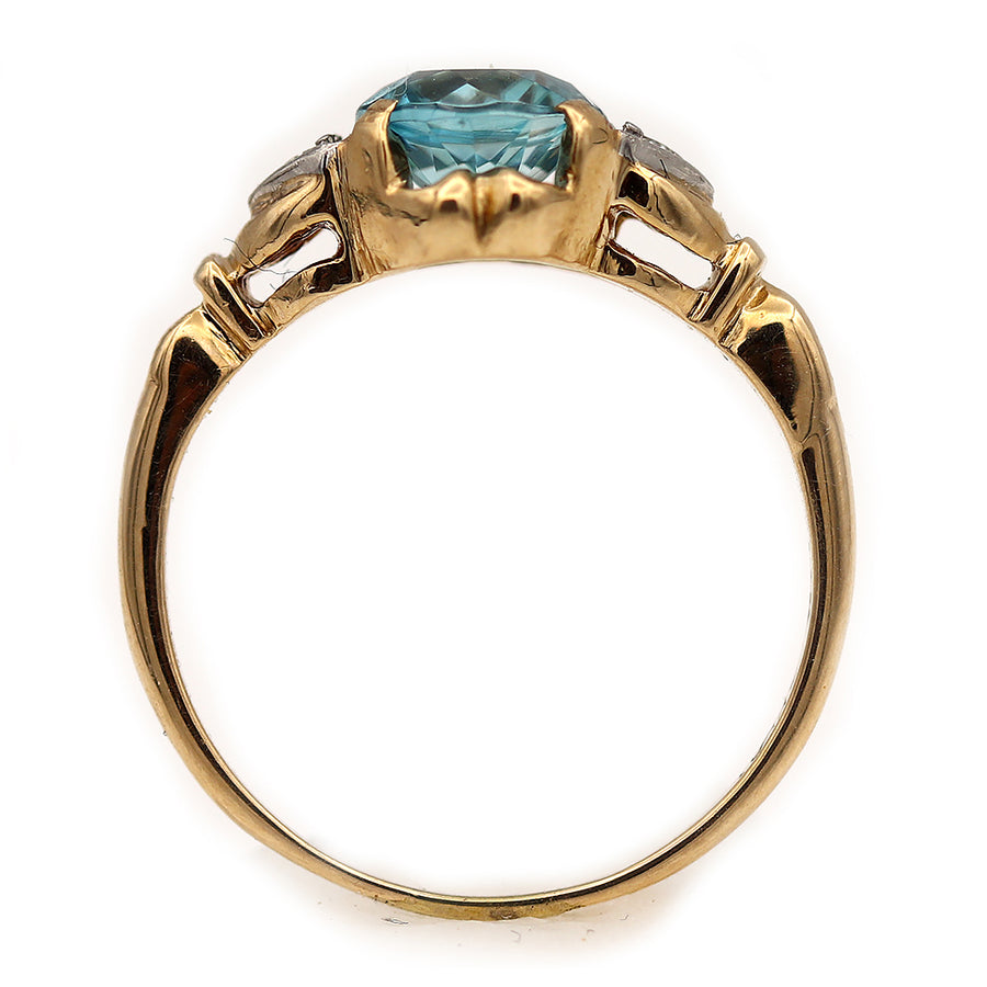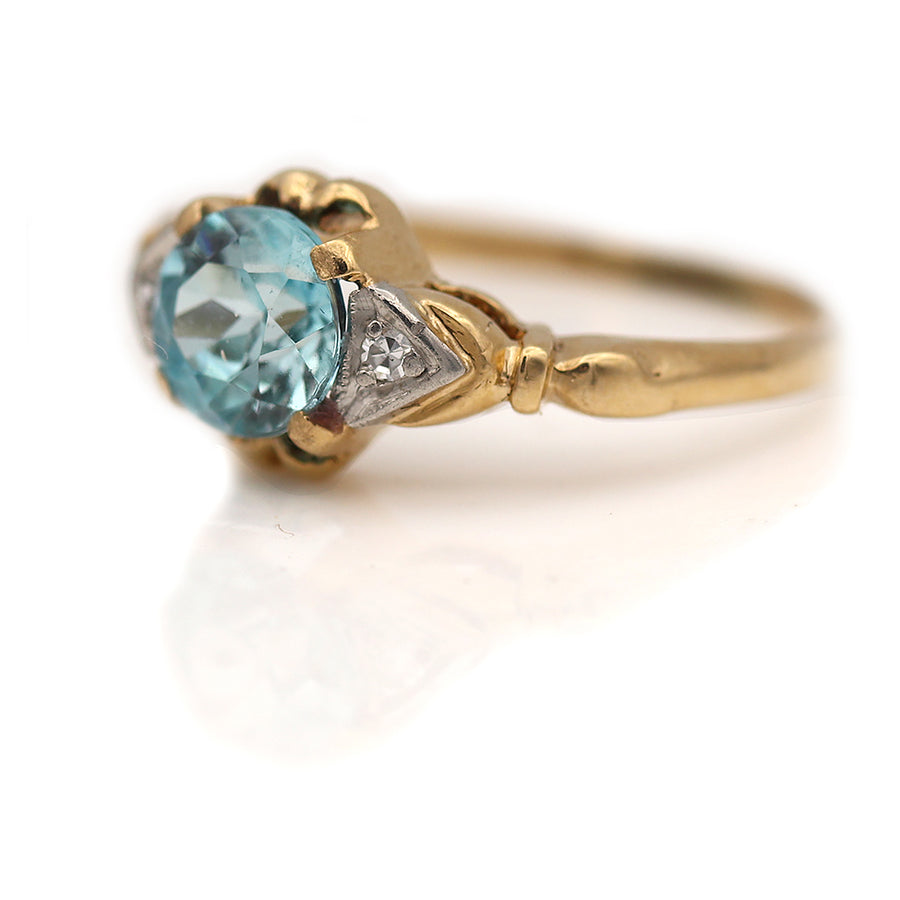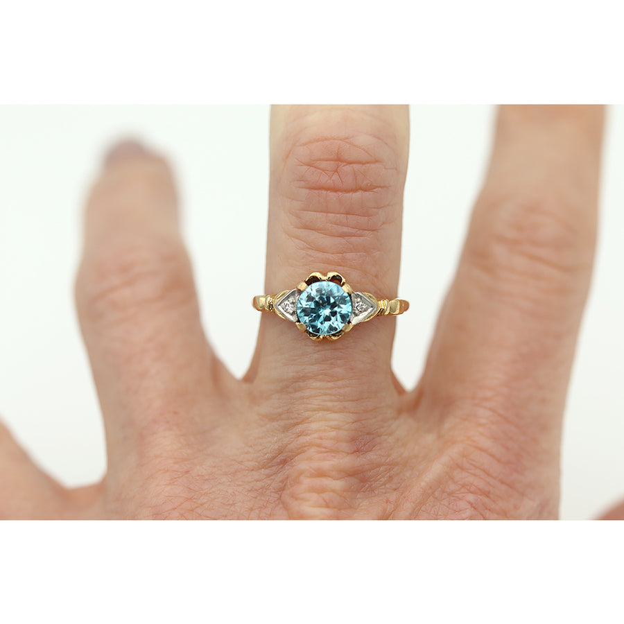 The Kelsaye ring is an authentic vintage engagement ring, circa 1940's, featuring a 1.05 carat old mine cut blue zircon, flanked by two (2) single cut diamond accents. Beautifully crafted in 14 kt two tone gold, and accentuated with delicate milgrain engravings, this is the perfect non diamond engagement ring. In very good condition.