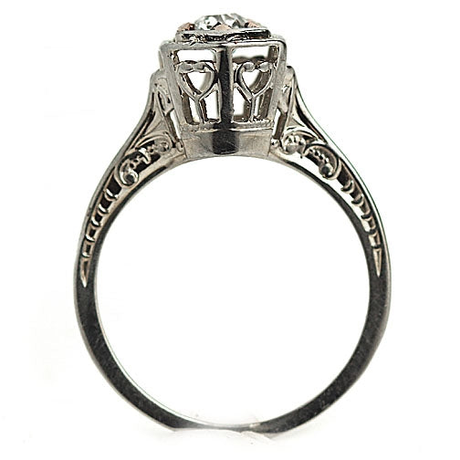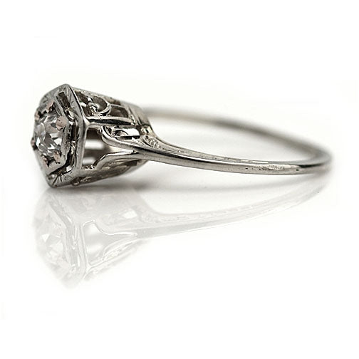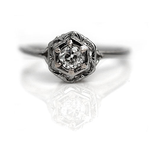 The Lucy Lee ring is an authentic vintage diamond engagement ring from the Art Deco era circa 1930's. The ring features a .35 carat old mine-cut diamond of H color, SI1 clarity, residing from within a geometric hexagonal frame. The diamond stands tall and proud in a 14 karat white gold setting, accentuated with filigree engravings and a heart motif. A sweet delicate ring. In good condition.