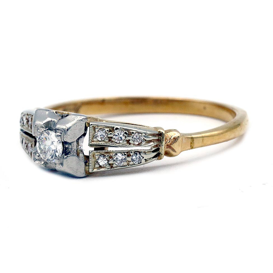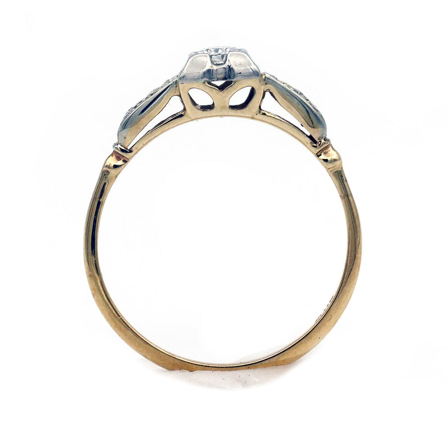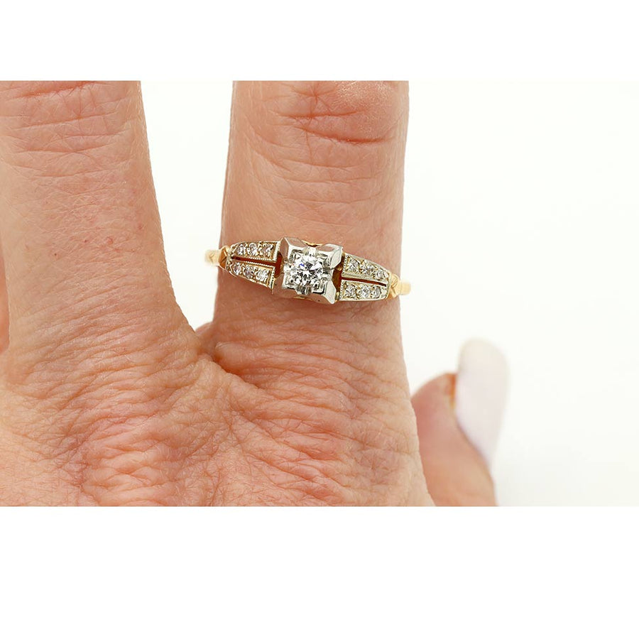 The Ruby M ring is an authentic vintage diamond ring circa 1940s. The ring features a .15 carat old European cut diamond of E color, VS2 clarity, flanked by a sleek split shank encrusted with 12 single cut diamond accents. Crafted in 14 karat white gold atop a yellow gold ring, accentuated with delicate milgrain engravings. A classic 1940's ring, in very good condition.