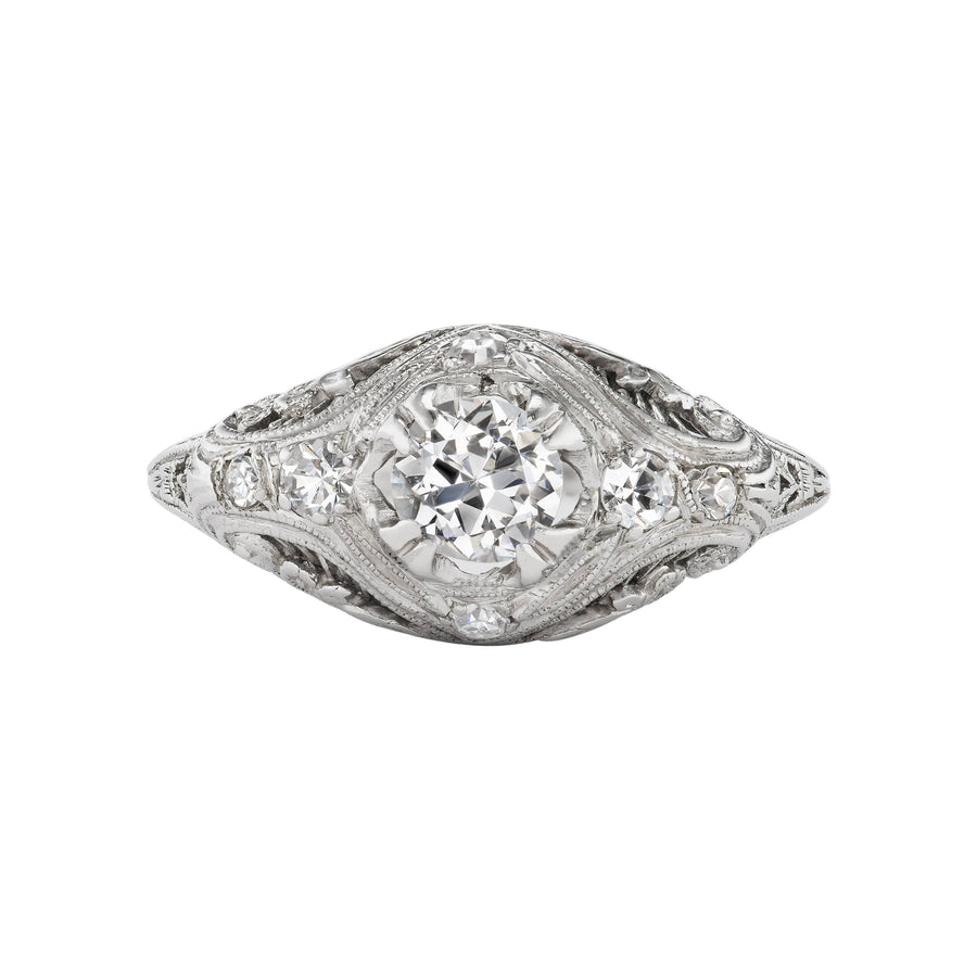 The Jacqueline ring is an authentic vintage engagement ring from the Art Deco era. The ring features a bright-white .40 carat old European-cut diamond of G color, SI1 clarity, flanked by 6 single cut diamond accents. The diamond resides in a platinum setting with 4 double knife edge prongs. Crafted in the 1920's, hand-finished with swirls of intricate open metal work and filigree engravings. An exquisite, Art Deco masterpiece! In excellent condition!