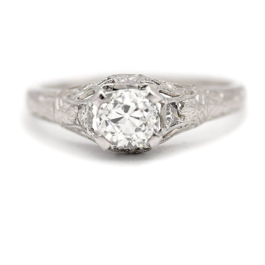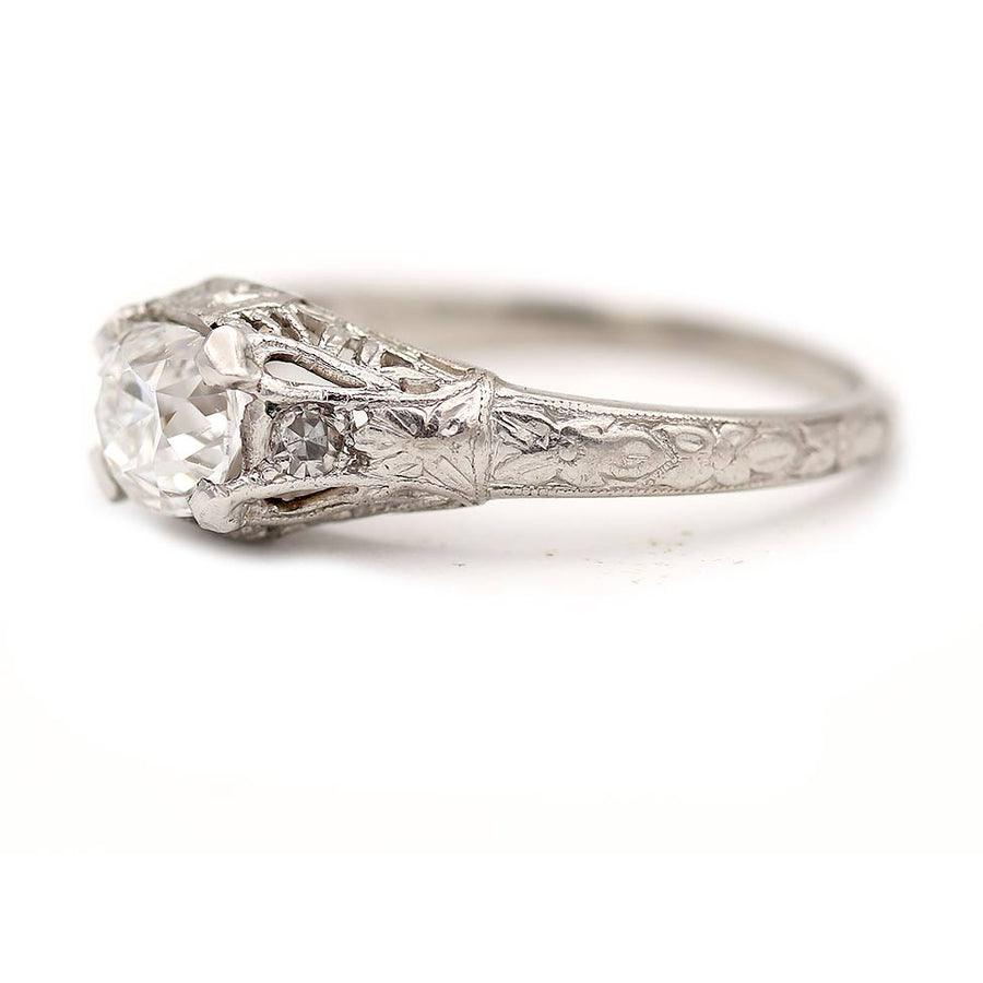 The Veni ring is an authentic vintage engagement ring from the Art Deco era, circa 1930's. This ring features a .76 carat GIA old mine cut diamond stating E color and VS2 clarity, flanked by two (2) single cut diamond accents. Beautifully crafted in platinum, accentuated with open metal work and intricate filigree engravings. A lovely vintage piece. In very good condition.