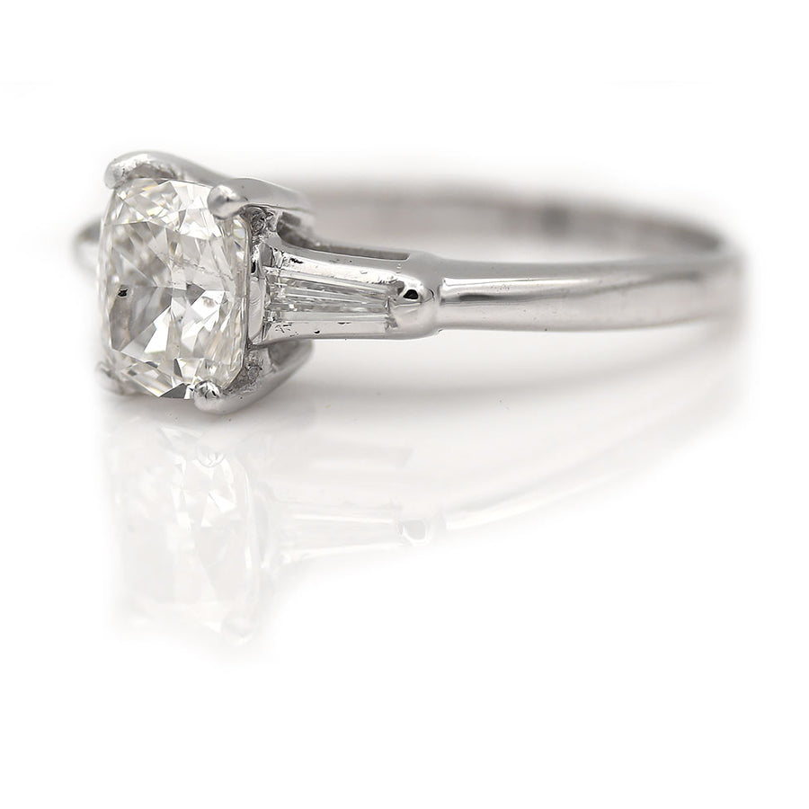 The Bilali ring is an authentic vintage cushion cut diamond engagement ring, circa 1970's. This ring features a GIA certified 1.30 carat cushion cut diamond of G color and I1 clarity flanked by 2 tapered baguette diamond accents. Crafted in a classic 4 prong platinum setting. A rare and timeless cushion cut diamond ring, in very good condition.