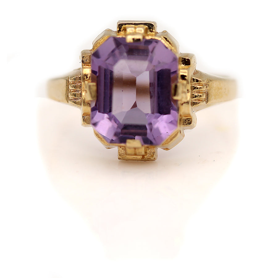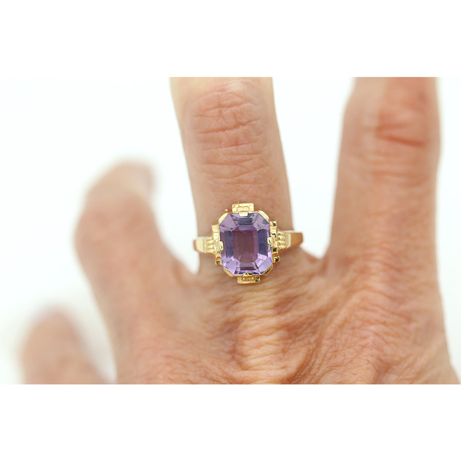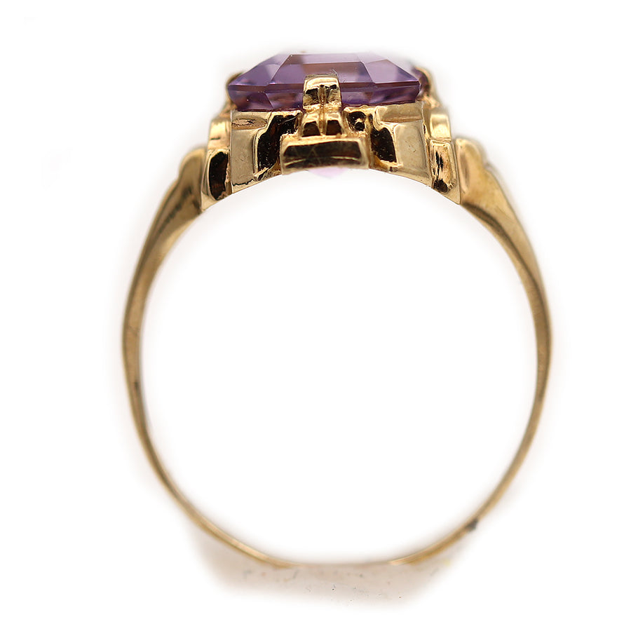 The Sky ring is an authentic vintage engagement ring from the Victorian era, circa 1900's, featuring a natural 2.25 carat rectangular cut amethyst. Hand-crafted in 10 kt yellow gold, this is a beautiful Art Deco engagement ring, perfect to wear on either hand. In very good condition.
