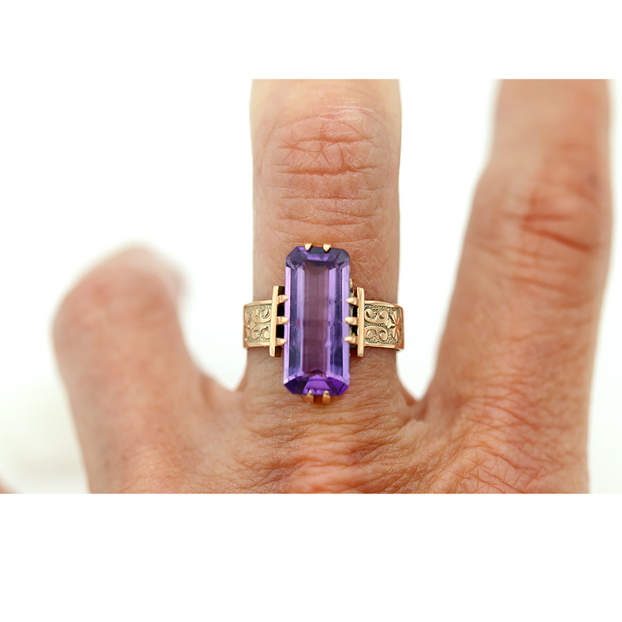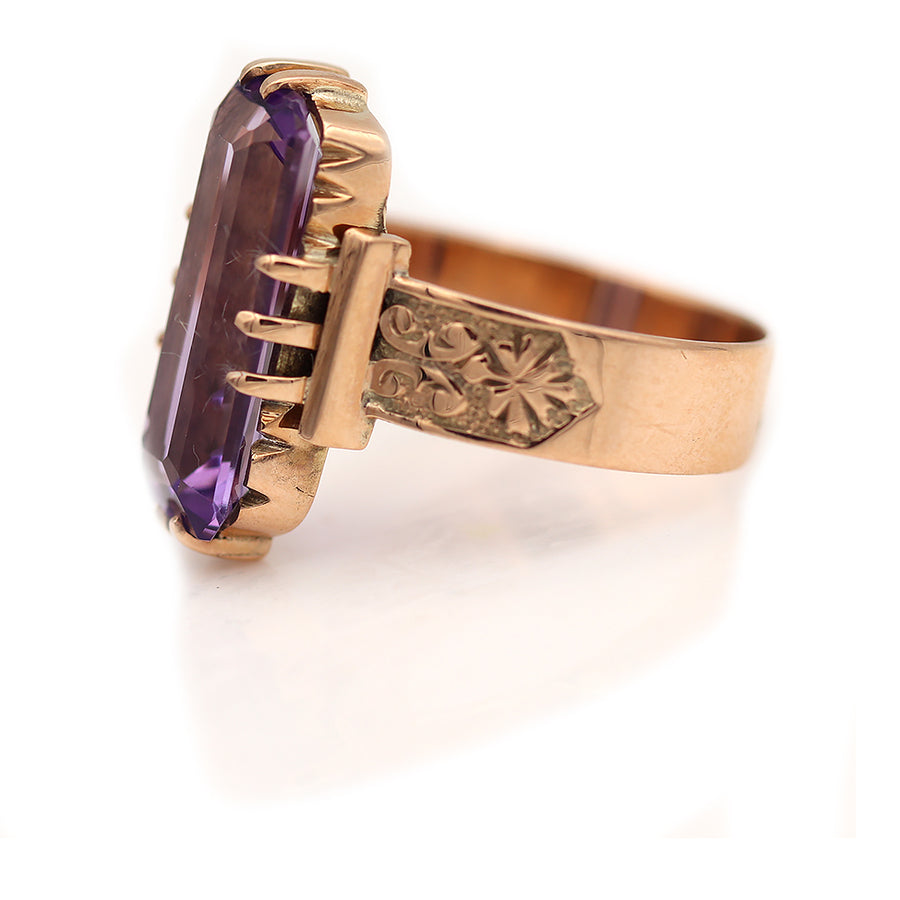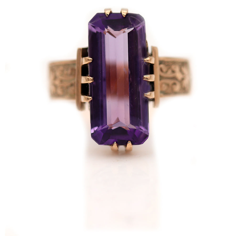 The Only ring is an authentic Victorian amethyst engagement ring circa 1900s. This ring features a natural 2.50 carat rectangular cut amethyst. Hand-crafted in 10K rose gold, accentuated with delicate filigree engravings. A beautiful alternative engagement ring, perfect to wear on either hand. In very good condition.