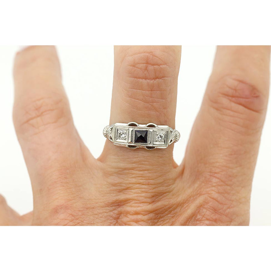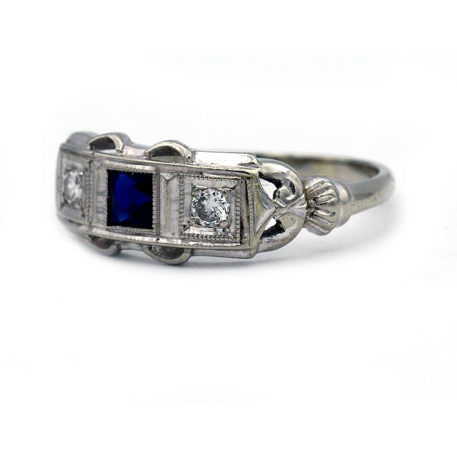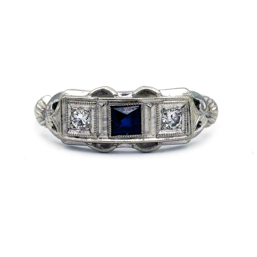 The Simi ring is an authentic antique wedding ring circa 1930s. The ring features a .15 carat synthetic square cut sapphire residing in a geometric square frame. The sapphire is flanked by 2 transitional cut diamonds. Crafted in 18 karat white gold, beautifully finished with open metal work and milgrain engravings. A timeless Art Deco wedding ring, perfect to wear on either hand.