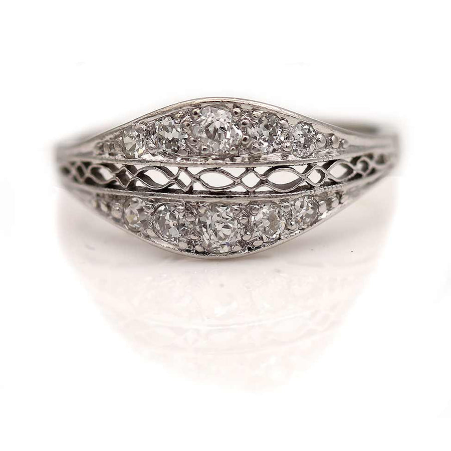 The Randy wedding ring is an authentic vintage wedding ring from the Art Deco era, circa 1930s. This ring features ten (10) natural vintage old mine cut diamonds weighing .35 ctw. Beautifully crafted in platinum, and accentuated with open metal work. Perfect to wear by itself or to stack with other vintage bands. In very good condition. Rare and very hard to find.