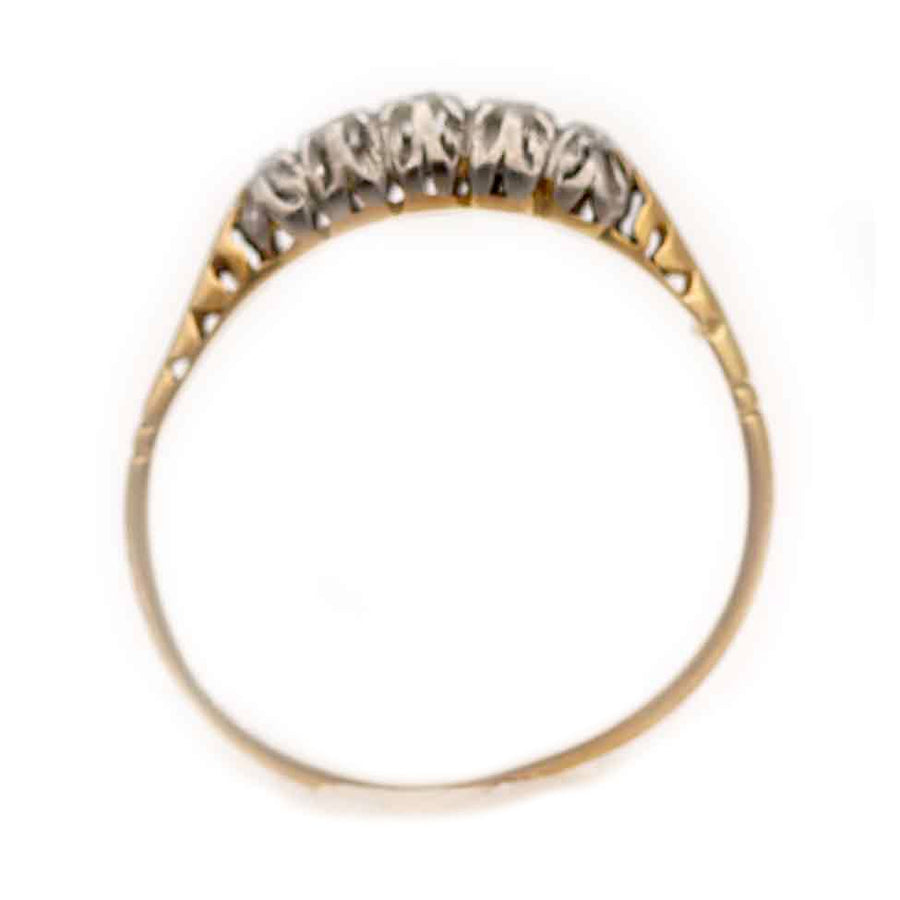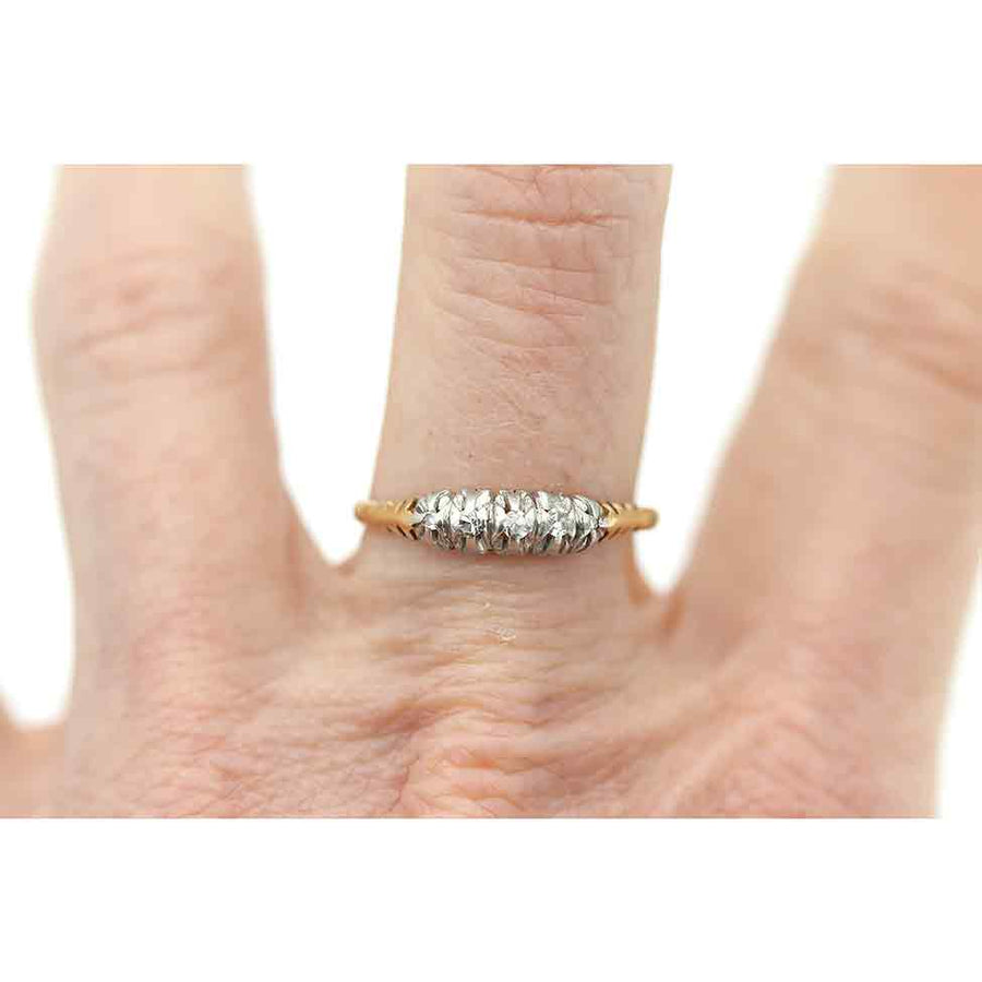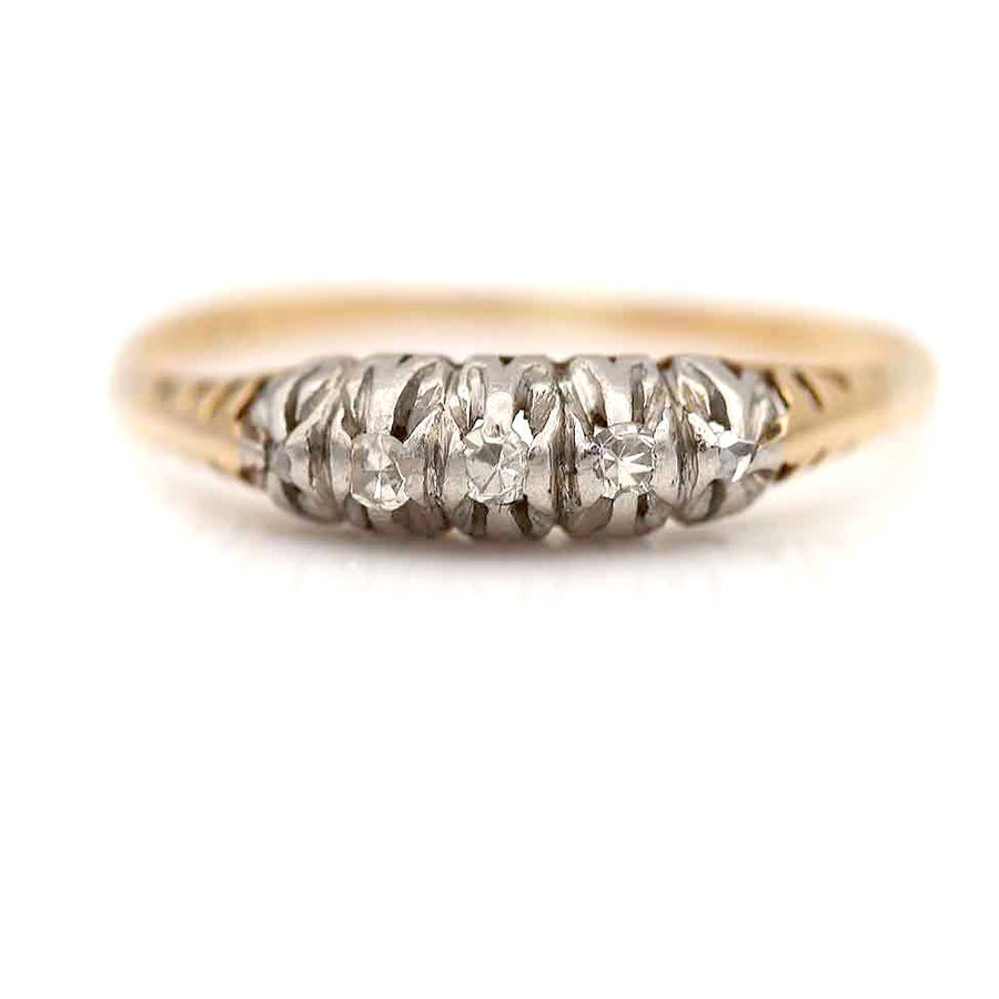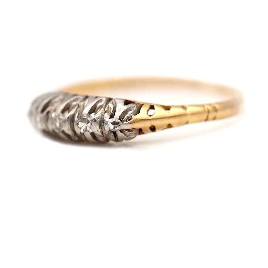 The DePaul ring is an authentic Victorian wedding band, circa 1900's, featuring three (3) vintage single diamonds and two (2) rose cut diamonds. Beautifully crafted in 18 kt two-tone gold, this is a sweet, delicate Victorian band. Perfect to wear alone or stack with other rings. In very good condition.