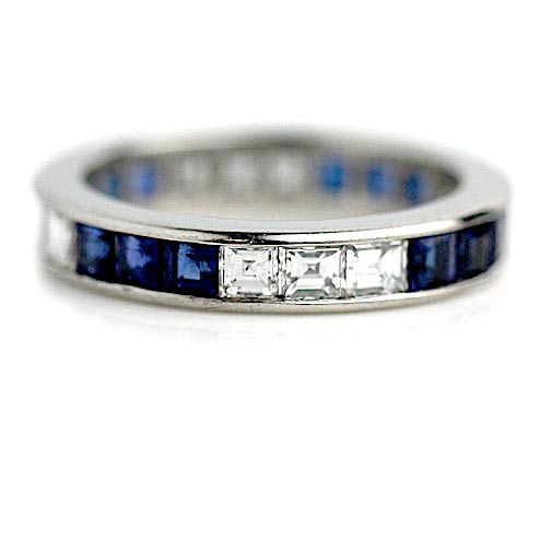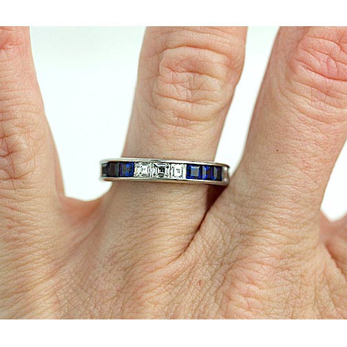 Mid-Century Sapphire & Square Cut Diamond Platinum Vintage Eternity Wedding Band