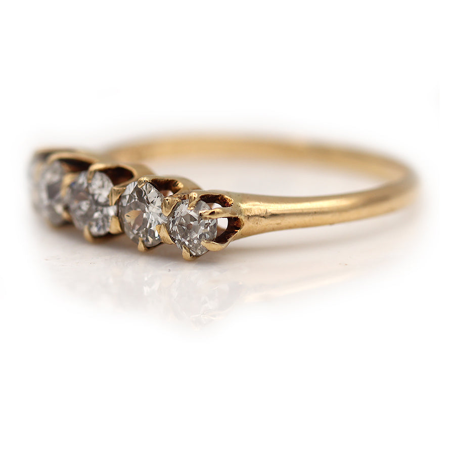 The Henderson ring is an authentic vintage wedding ring from the Victorian era, circa 1900's. This ring features five (5) old mine cut diamonds of I color and SI1-SI2 clarity, weighing approximately .80 ctw. Beautifully crafted in an original 14 kt yellow gold Victorian setting, this ring is perfect to stack with other vintage rings. In good condition.