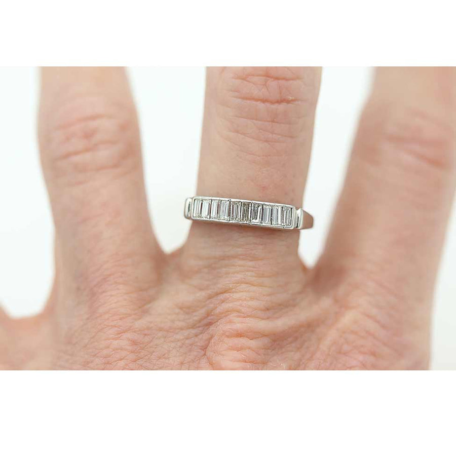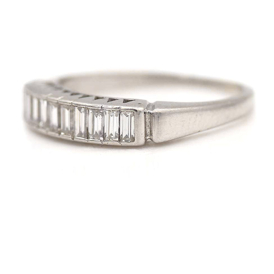 The Ingram band is an original vintage wedding band, circa 1970's. This band features ten (10) vintage straight baguette cut diamonds, weighing approximately .50 carat with H color and VS2 clarity. Beautifully crafted in platinum, this band is perfect to wear on either hand or even stack with your favorite vintage wedding bands. In very good condition.