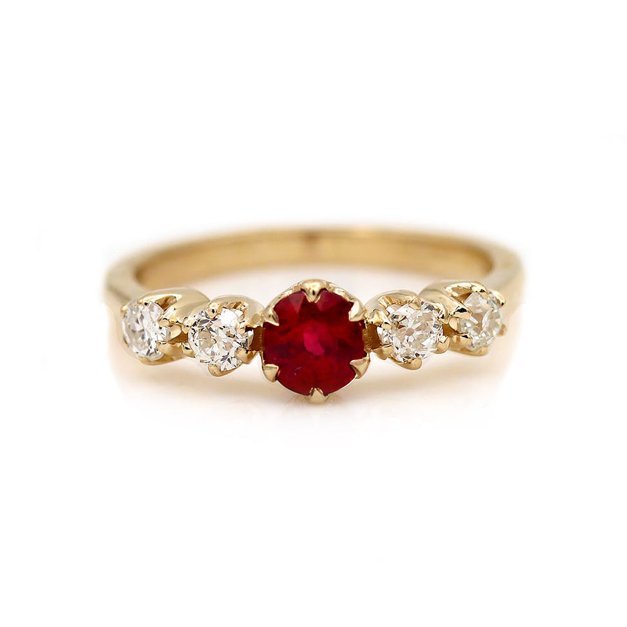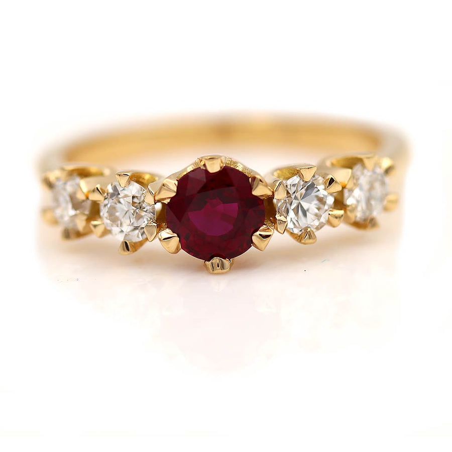 The Lacey ring is a vintage inspired VDR.com made wedding ring using an authentic 1970's .59 pigeon blood natural Burma ruby and a quartet of authentic old European cut diamonds circa 1930's. Crafted in a gleaming recycled 14 karat yellow gold setting. This piece is based on an authentic vintage ruby ring we once owned! Perfect in every way, in pristine condition. Made with love in NYC!