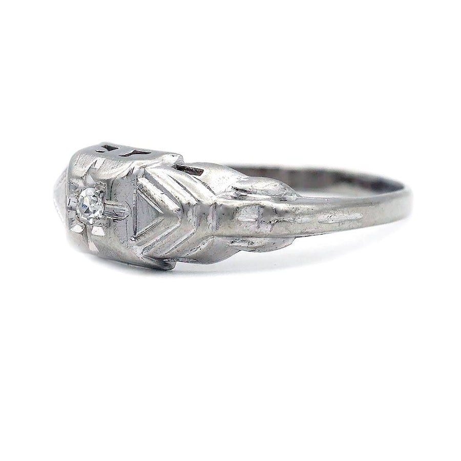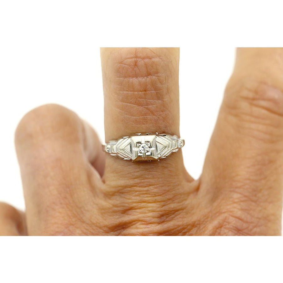 Art Deco .05 CT Single Cut Diamond Engagement Ring | Tiered Engravings, 14K White Gold