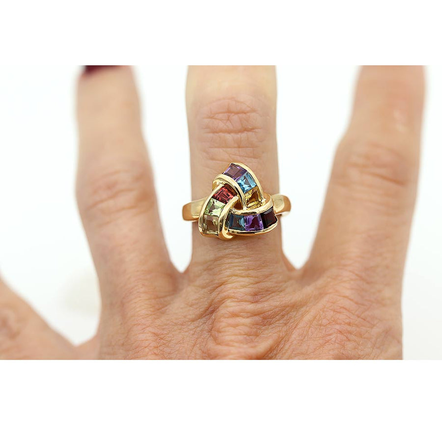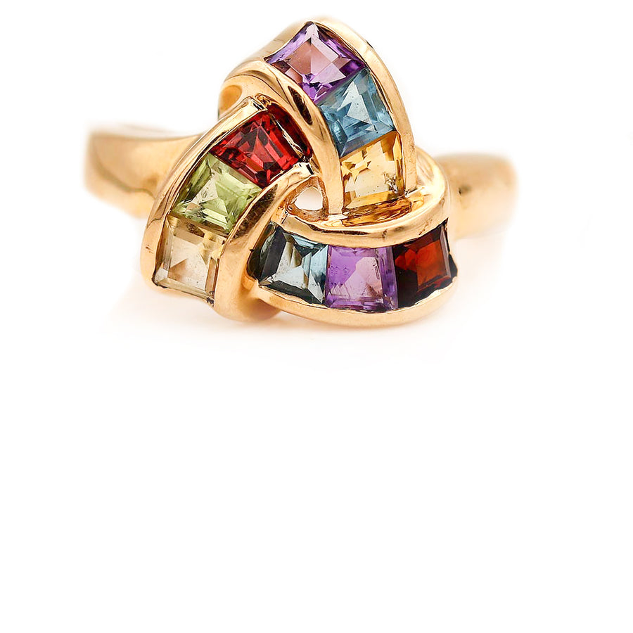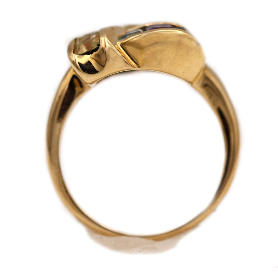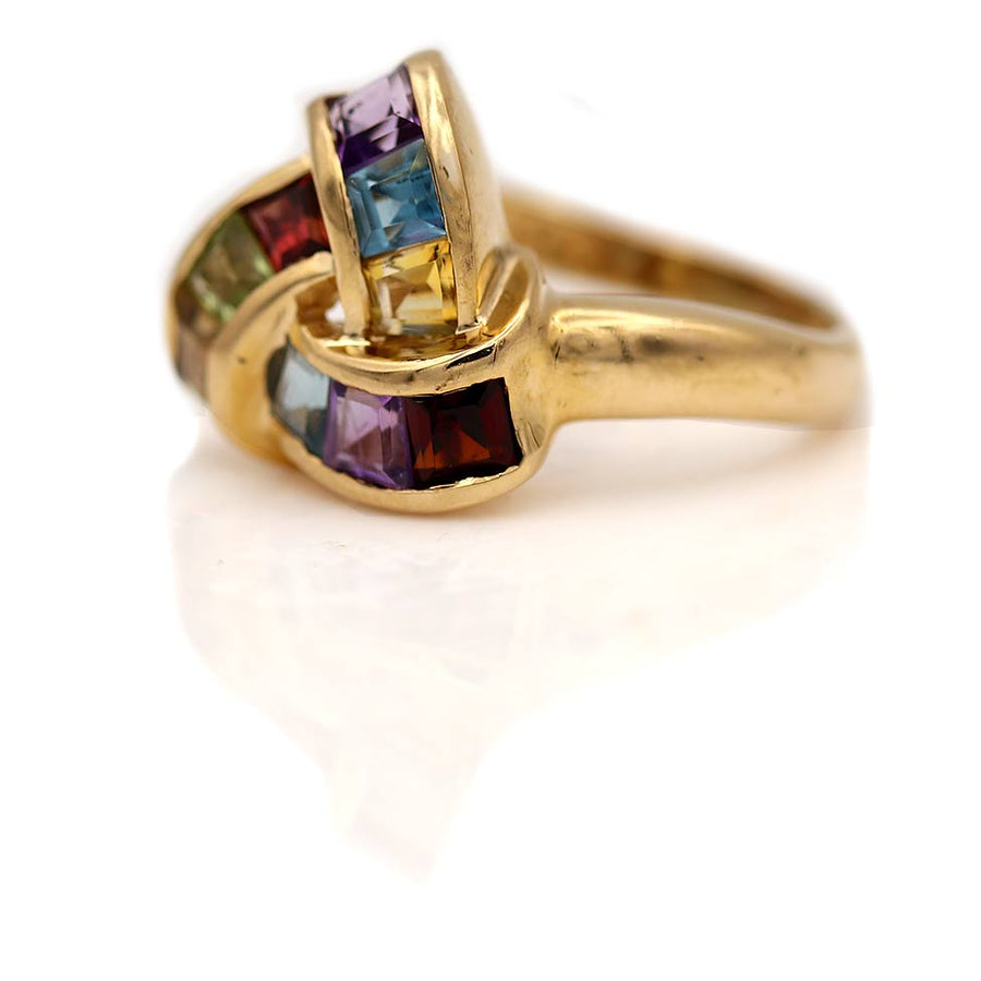 The Heather ring is an authentic vintage gemstone engagement ring, circa 1980s. This ring showcases two (2) channel set garnets, two (2) amethysts, two (2) orange topaz , two (2) aquamarines, two (2) citrines and one (1) green peridot. Beautifully crafted in 14 kt yellow gold, this is a beautiful cocktail ring, perfect to wear on either hand. In very good condition.