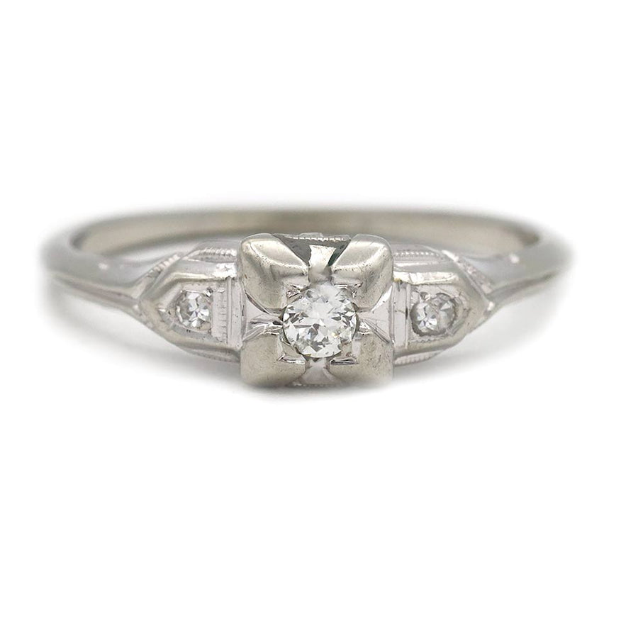 The Tierney ring is an authentic Art Deco engagement ring circa 1930s. The ring features a .15 carat old European cut diamond of H color, VS2 clarity, residing in a geometric square frame. The diamond is flanked by 2 single cut diamond accents. Beautifully crafted 18 karat white gold, completed with delicate milgrain engravings. A classic and lovely Art Deco piece. In very good condition.