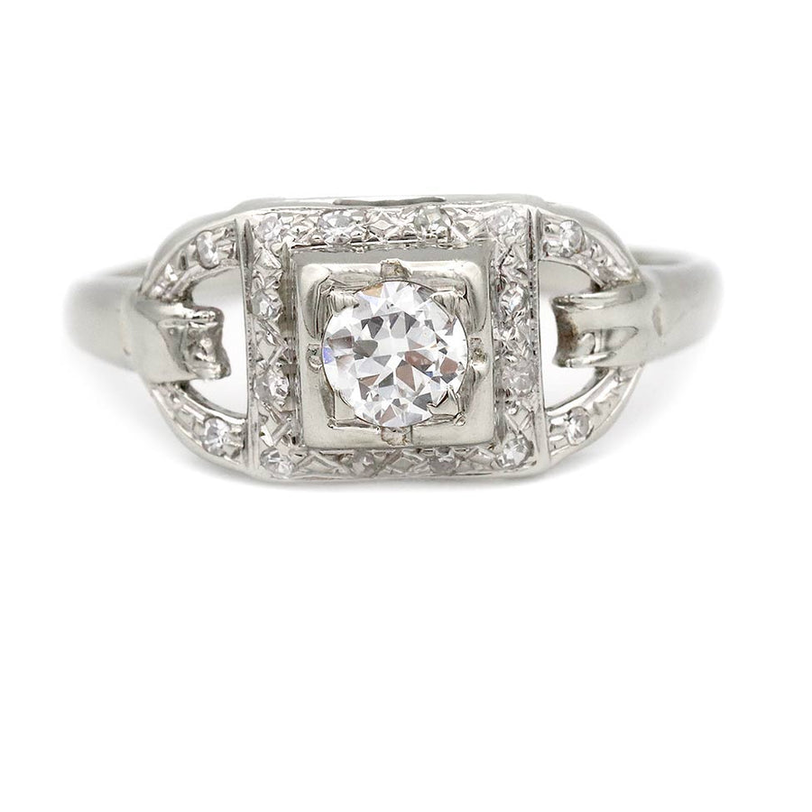 The Forevermore ring is an authentic antique engagement ring from the Art Deco era, circa 1930s. This ring features a bright-white .30 carat old European cut diamond (F color and VS2 clarity), residing within a geometric square frame, surrounded by twelve (12) single cut diamond accents. Beautifully crafted in 18 kt white gold, and accentuated with milgrain engravings. A sweet Art Deco piece, in very good condition.