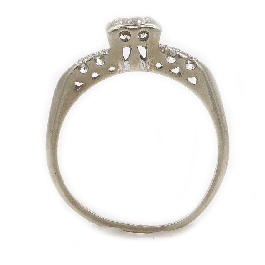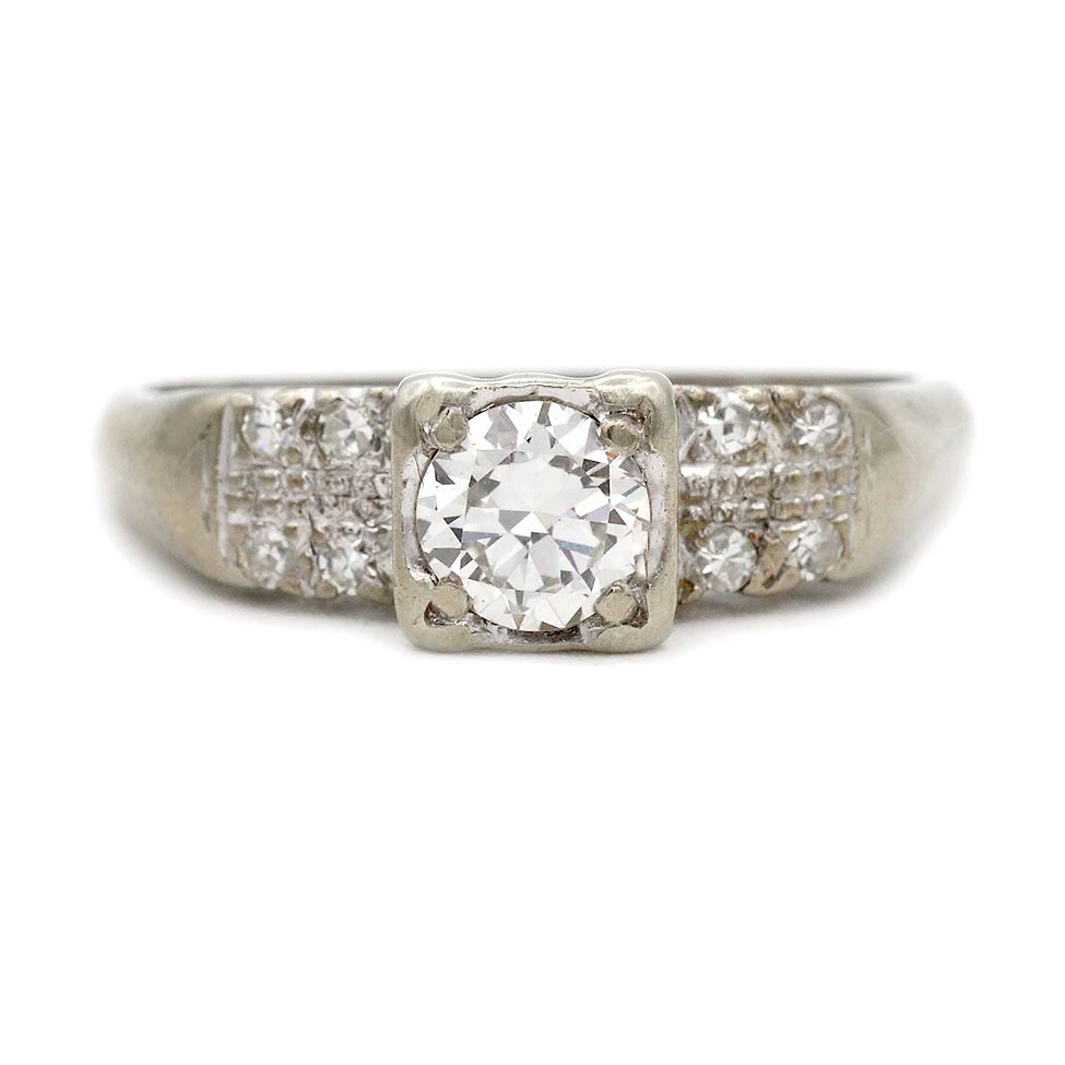 The Alma ring is an authentic antique diamond ring circa 1940's. The ring centers a .60 carat bright-white old European cut diamond of G color, VS2 clarity. The diamond is flanked by 8 single cut diamond accents. Crafted in the 1940's in gleaming 14 karat white gold. As pretty as can be and perfect to stack with any vintage bands. In very good condition.