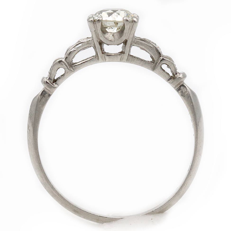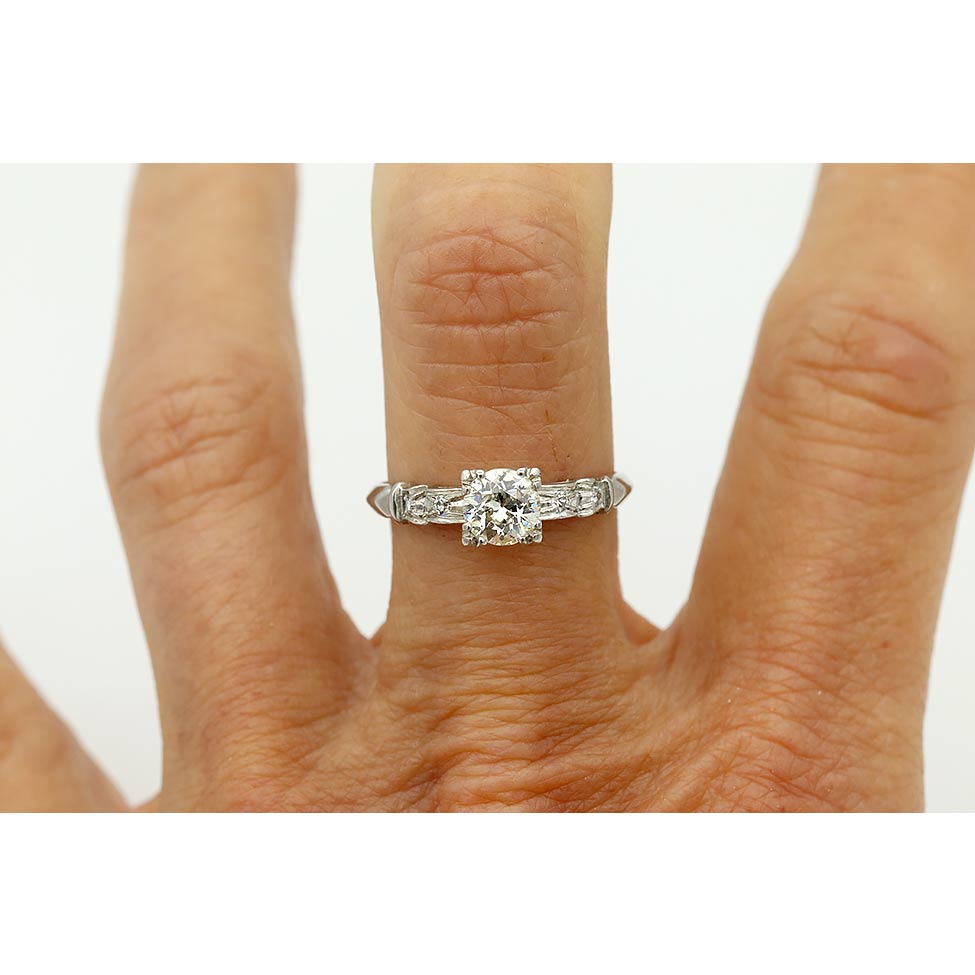 The Ida ring is an authentic vintage diamond engagement ring circa 1940's. The ring showcases an AGI certified .70 carat old mine cut diamond of J color, SI2 clarity, set within trefoil prongs. The diamond is flanked by 4 single cut diamond accents. Handcrafted in platinum, accentuated with intricate filigree engravings and an open work gallery. A captivating ring featuring a vibrant antique diamond and beautiful filigree detailing.
