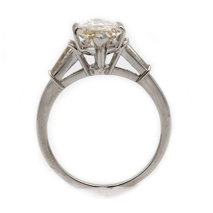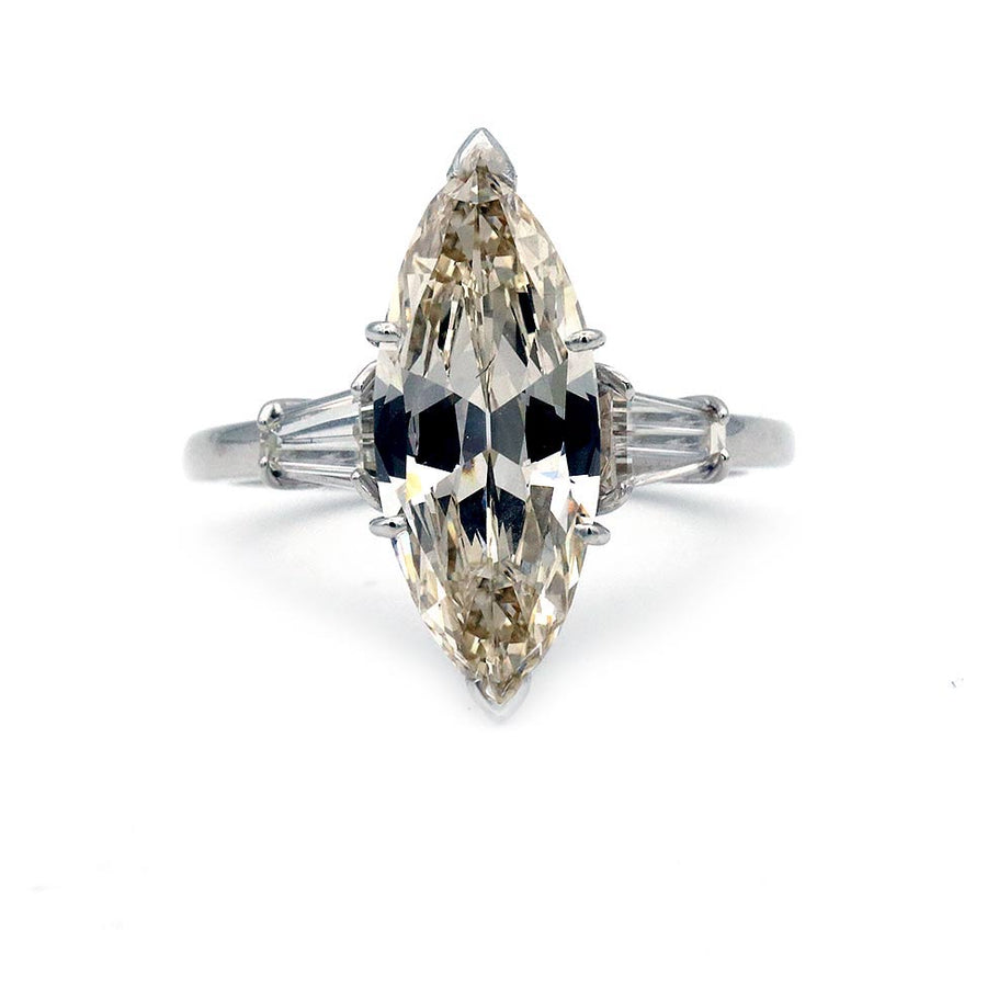 The Perla ring is an authentic vintage engagement ring circa 1970s, featuring a GIA certified 3.04 carat marquise cut diamond stating U-V color and natural light brown, flanked by two vintage tapered baguettes. Beautifully crafted in platinum. A show stopping vintage engagement ring. In very good condition. Size 6.5