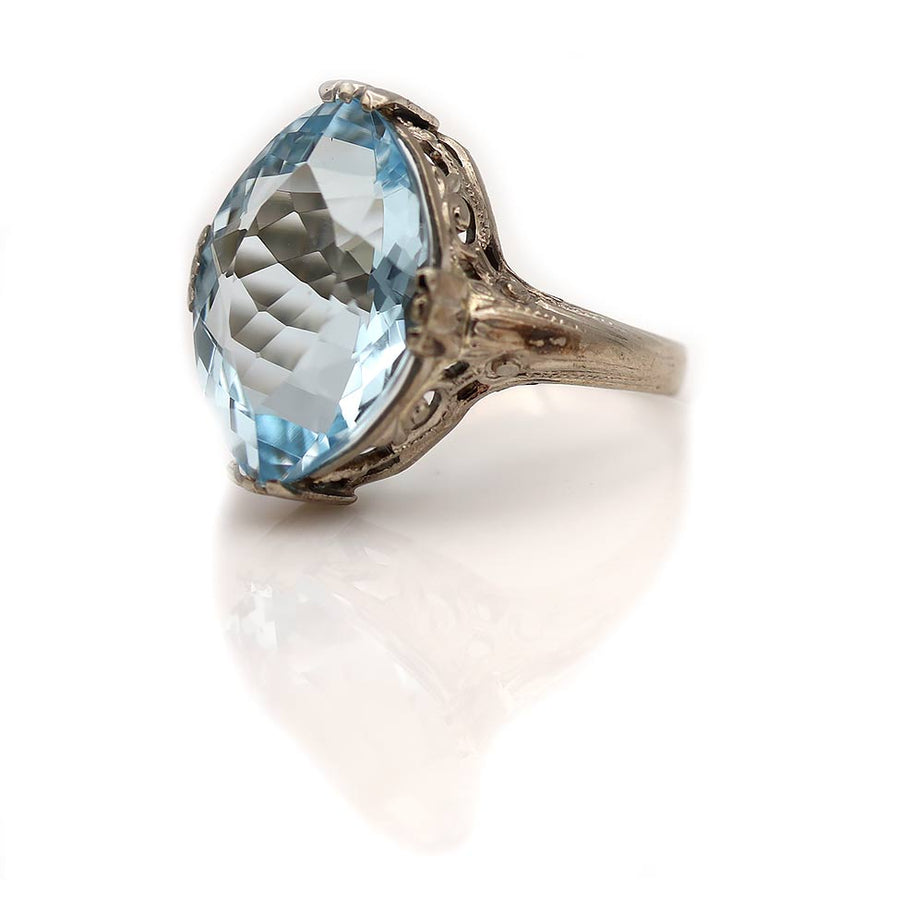 The Medley Ring is a rare 1930s Art Deco engagement ring featuring a 7.50 carat natural oval aquamarine with a striking sky-blue hue. Handcrafted in 14k white gold with intricate filigree and milgrain details, this unique vintage piece is perfect for those seeking an alternative gemstone ring.