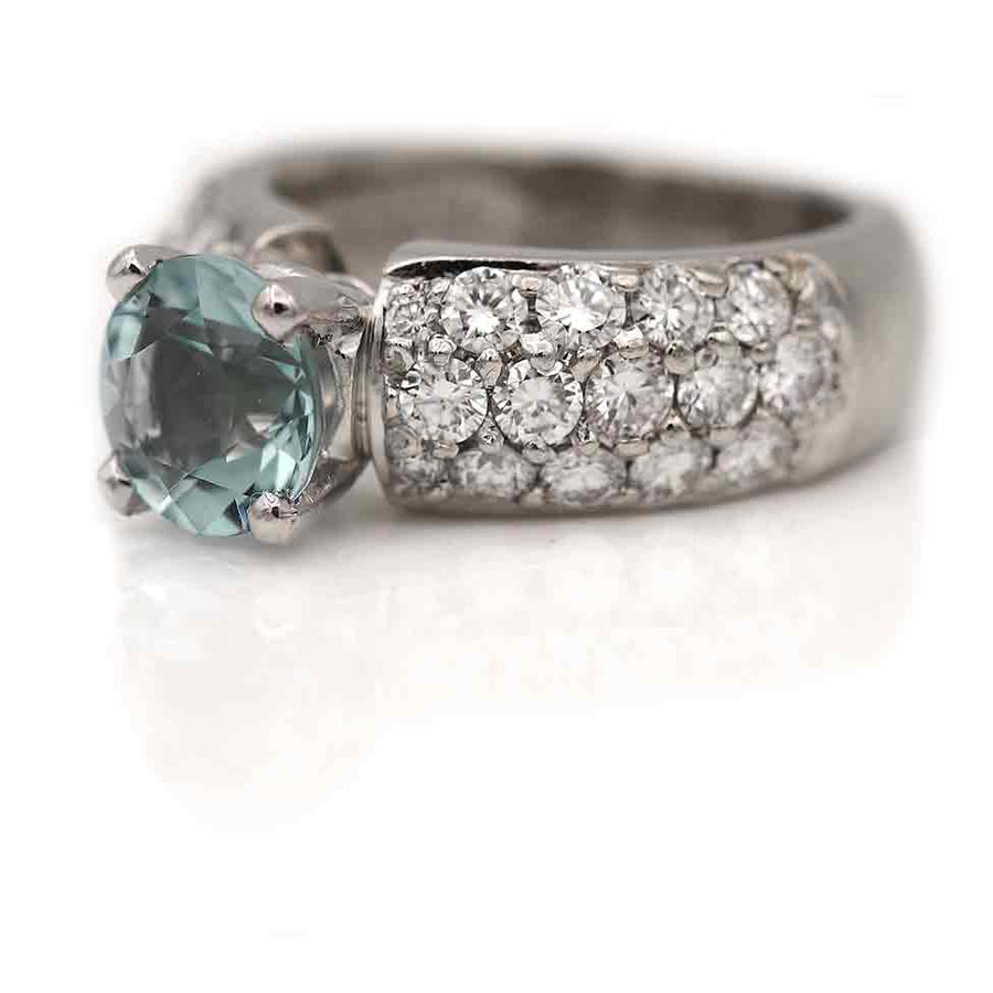 The Arnaux ring is an authentic vintage engagement ring, circa 1980's. This ring centers a natural 1.50 carat round cut sky blue aquamarine, surrounded by thirty (30) pave set diamonds. Beautifully crafted in platinum. Perfect to wear on either hand. A stunning engagement ring. In very good condition. Magnifique!