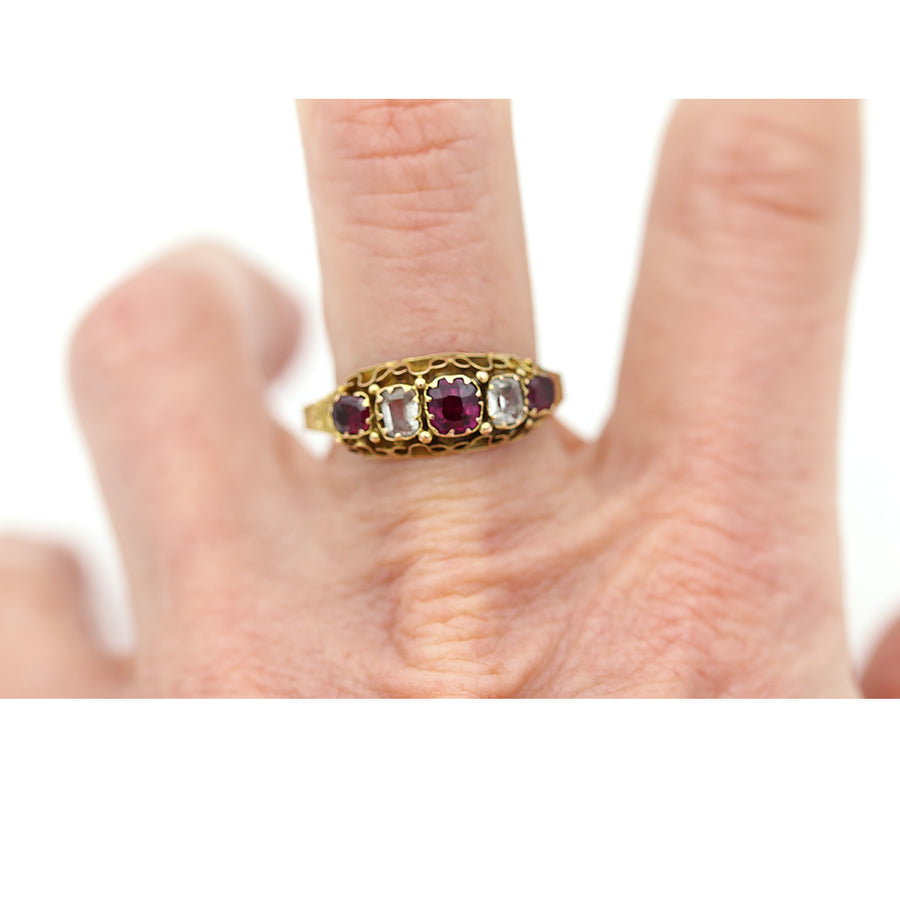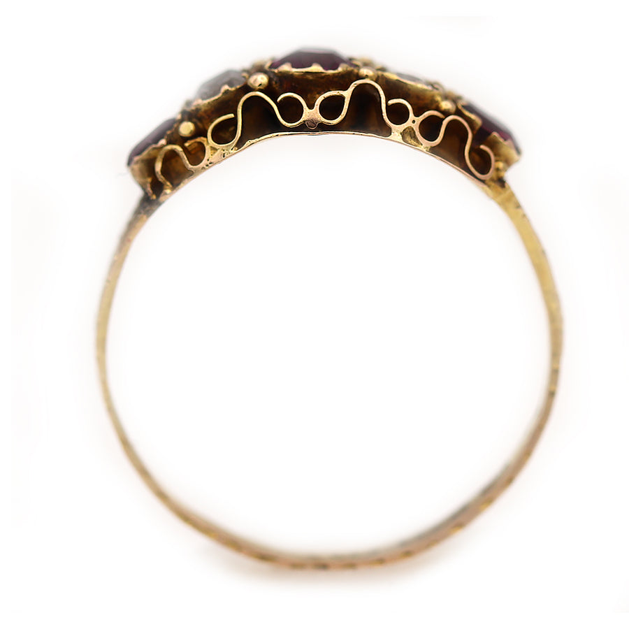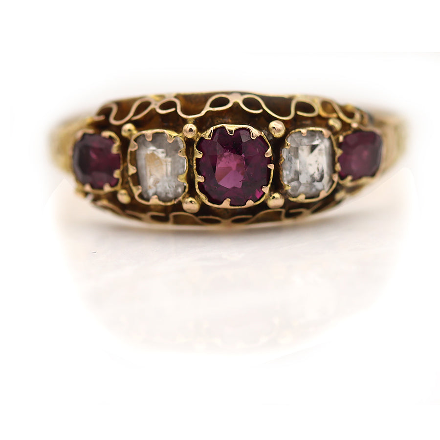 The Mele ring is an authentic vintage wedding ring from the Victorian era, circa 1900's. This ring features three (3) natural deep purple cushion cut almandine garnets and two (2) natural white cushion cut Aquamarines. Beautifully crafted in an original 15 kt yellow gold Victorian setting, this ring is perfect to wear alone or stack with other vintage rings. In very good condition.