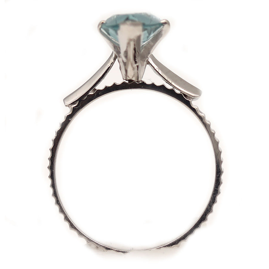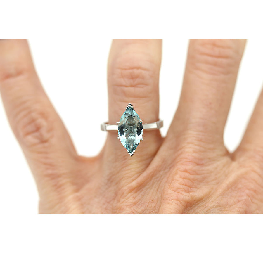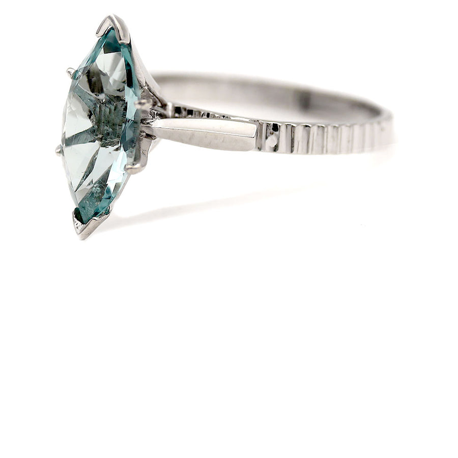 The Hatley ring is an authentic vintage aquamarine engagement ring, circa 1970's. This ring features a natural sky blue 2.00 carat marquise cut aquamarine standing tall and proud in a 14 kt white gold setting accentuated with ribbed engravings. In very good condition.