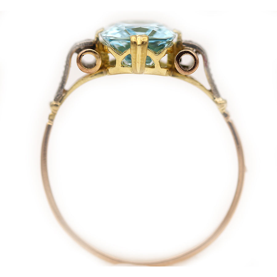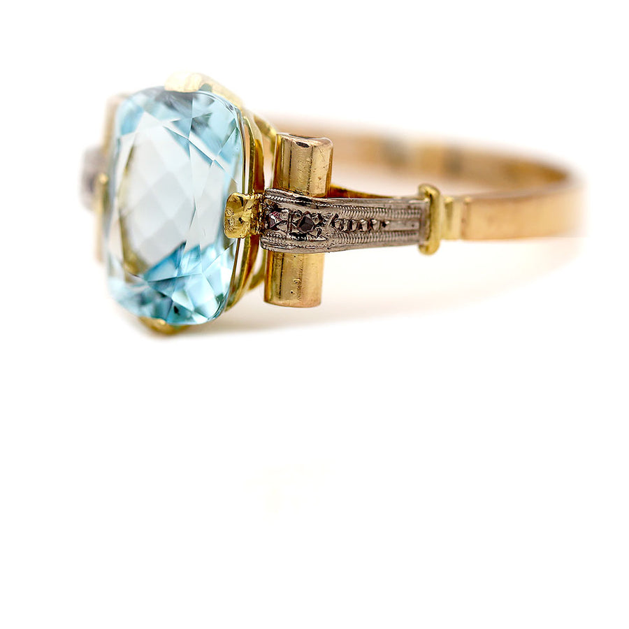 The Shire ring is an authentic vintage engagement ring dating to the 1940s. This lovely Retro-era ring features a sky-blue natural cushion cut aquamarine weighing approximately 3.90 carats, flanked by four natural rose cut diamond accents that add soft antique sparkle. Beautifully crafted in a 14 karat two-tone gold setting, the ring is finished with delicate milgrain and filigree engraving that enhances its vintage character. A graceful and eye-catching gemstone ring, offered in very good vintage condition.