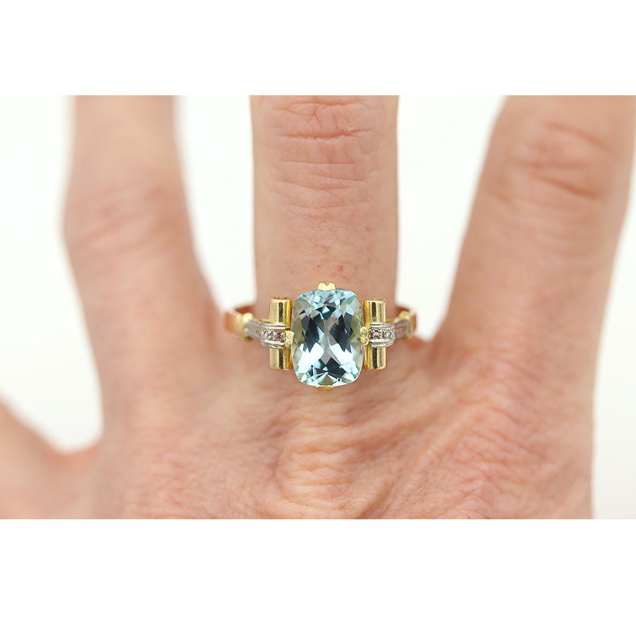 Retro 3.90 Ct Cushion Cut Aquamarine & Rose Cut Diamond Vintage Engagement Ring | 14K Two-Tone Gold