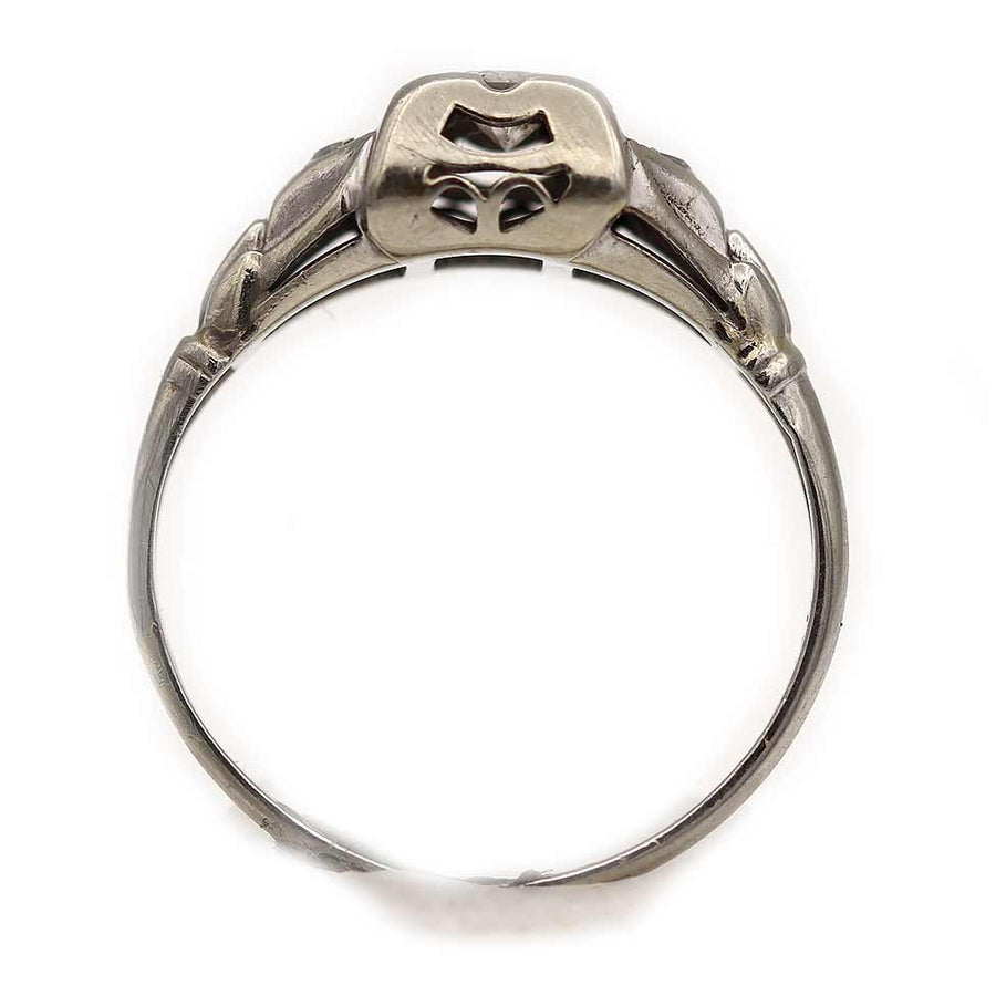 The Weston ring is an authentic vintage engagement ring, circa 1940s. The ring features a .10 carat old European cut diamond set within a geometric square frame, flanked by two single cut diamond accents that add subtle sparkle. Crafted in 18 karat white gold and finished with open milgrain and delicate filigree engravings, this ring reflects the clean lines and craftsmanship of the period. A classic vintage piece, offered in good vintage condition.