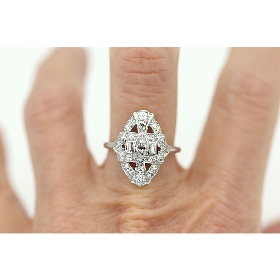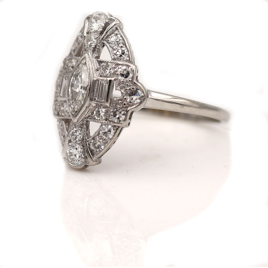 The Gwen ring is an authentic navette dinner ring circa 1960s. This stunning and authentic vintage piece features a bezel set .25 carat navette (marquise) shape diamond of H color, VS2 clarity. The diamond is flanked by 2 bezel set straight baguette cut diamonds and 22 single cut diamond accents. Crafted in gleaming platinum, accentuated with milgrain engravings. A rare, one of a kind rare vintage ring. This slender, low-profile ring is perfect to wear on either hand! In very good condition.