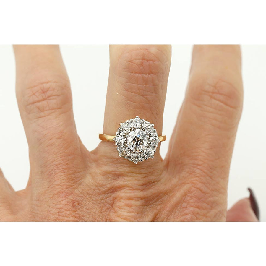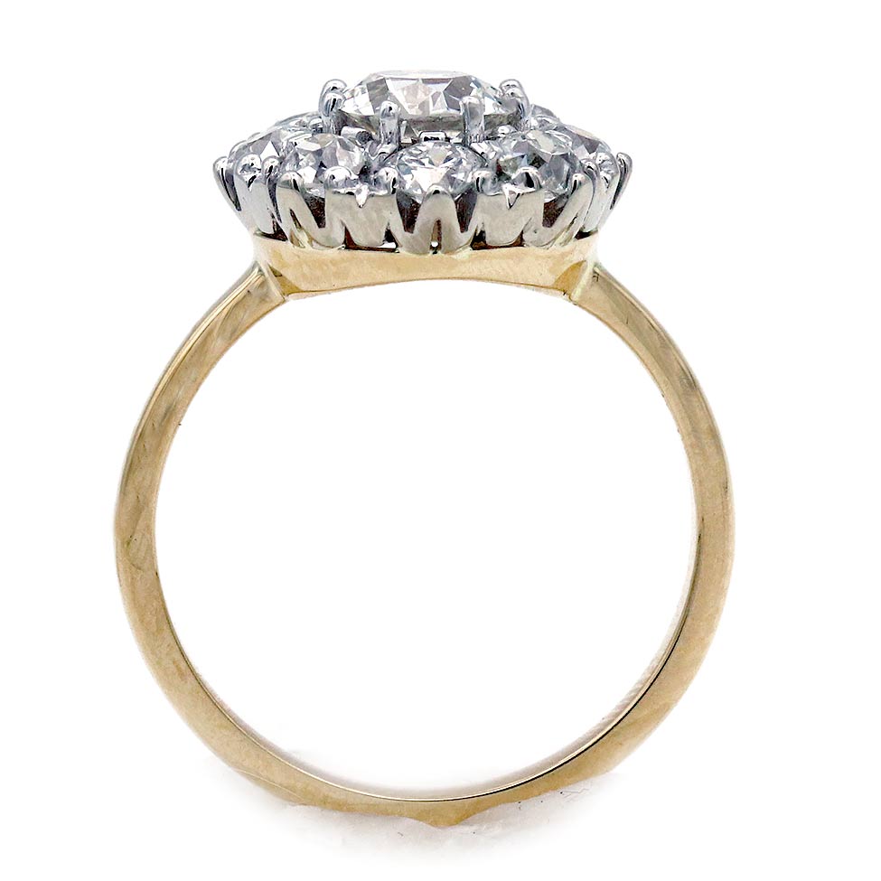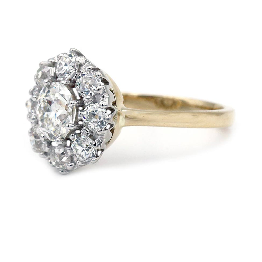 The Rivera ring is a VDR.com–made Victorian-style halo engagement ring inspired by an original antique piece from our collection. At its center is an authentic vintage old mine cut diamond weighing exactly .81 carats, accompanied by a GIA certificate stating H color and I1 clarity. The center diamond is set in an eight-prong setting and surrounded by eight original Old Mine cut diamond accents, with a combined accent weight of approximately .85 carats. Beautifully crafted in recycled platinum and 18 karat gold, this ring is an exact copy of a Victorian halo ring we once owned, capturing the romance and character of the era.
