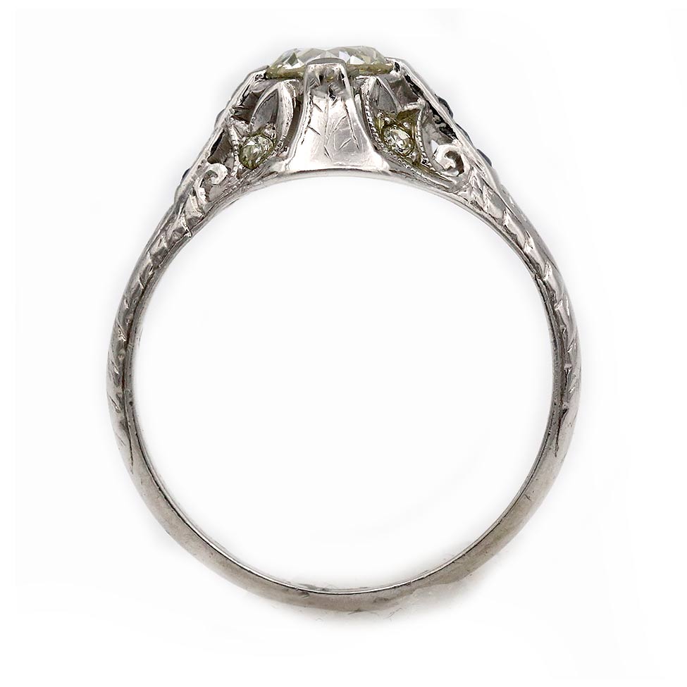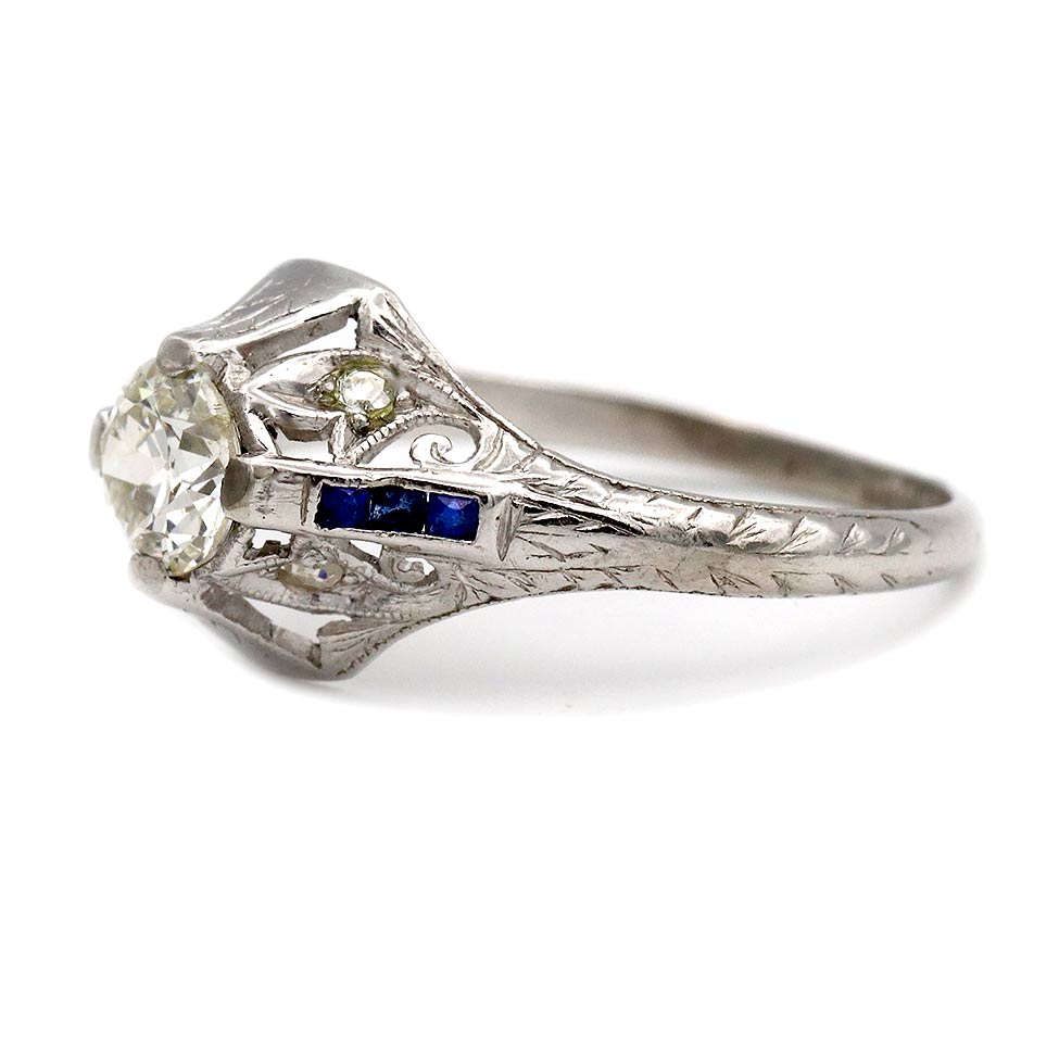 The Allegra ring is an authentic vintage engagement ring from the Art Deco era circa 1930's. The ring features an AGI certified .60 carat old European cut diamond of K color, VS2 clarity. The diamond is flanked by 6 natural square cut Burma sapphires, and 4 single cut diamond accents. Crafted in platinum, gracefully finished with swirls of open metal work and filigree engravings. A chic, timeless vintage piece. In good condition.