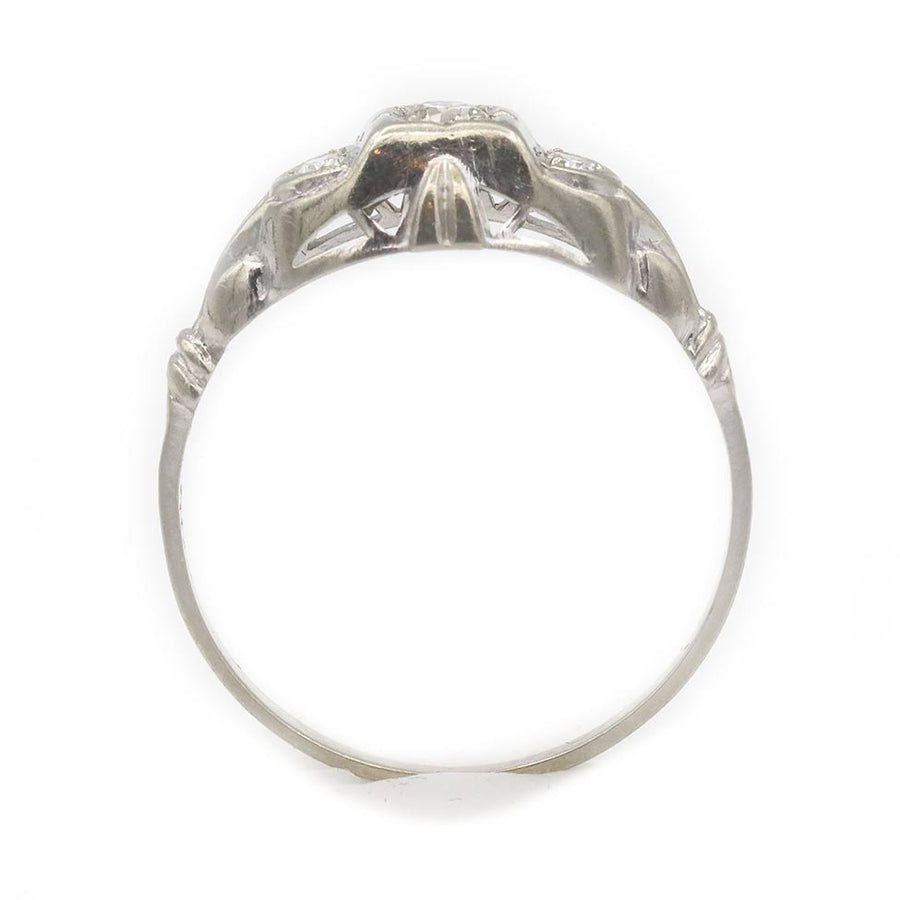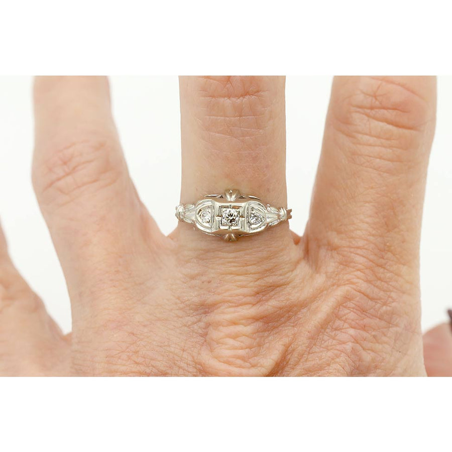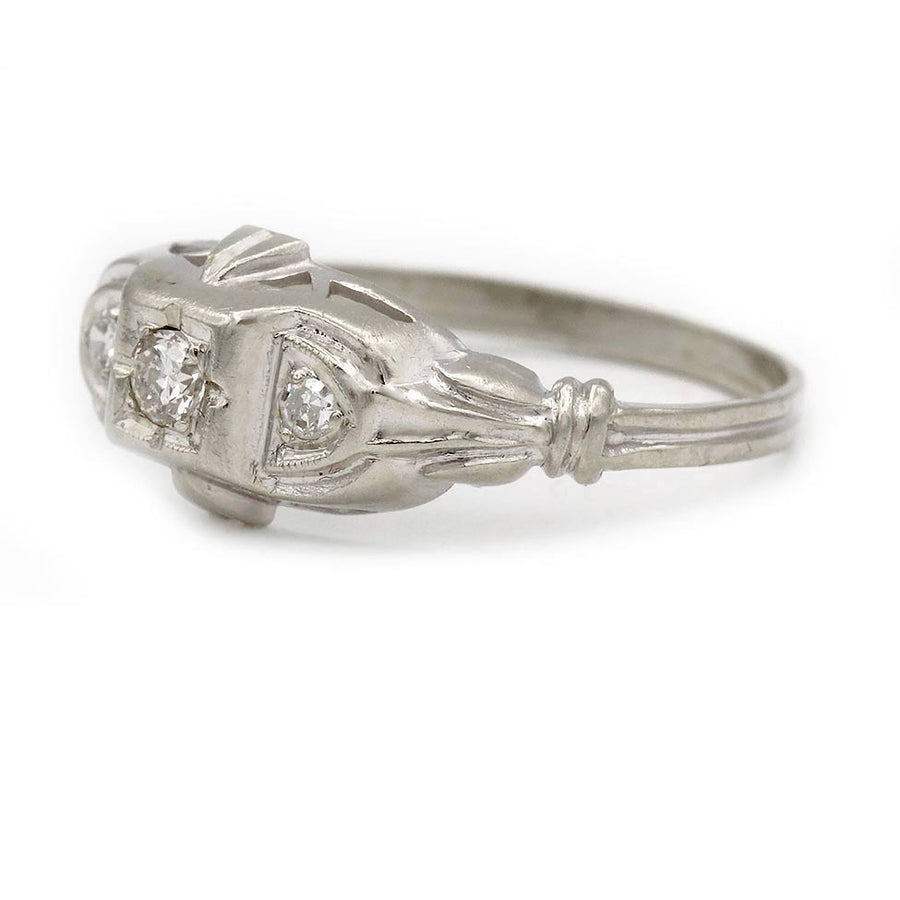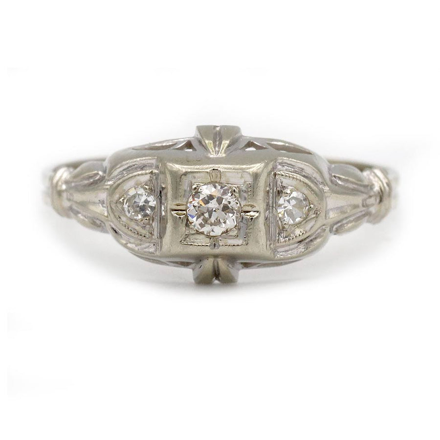 The Priscilla ring is an authentic 3 stone diamond engagement ring from the Art Deco Era circa 1920's. The ring showcases a .10 carat old European-cut diamond of J color, SI1 clarity, flanked by 2 single cut diamond accents residing in a geometric half moon frame. Crafted in 14 karat white gold, completed with delicate engravings and a fluted ring shank. A super charming vintage ring, in very good condition.