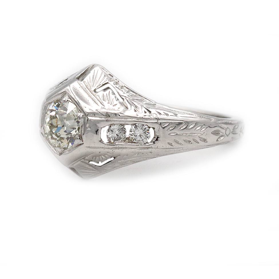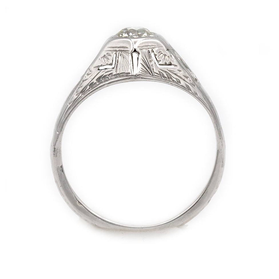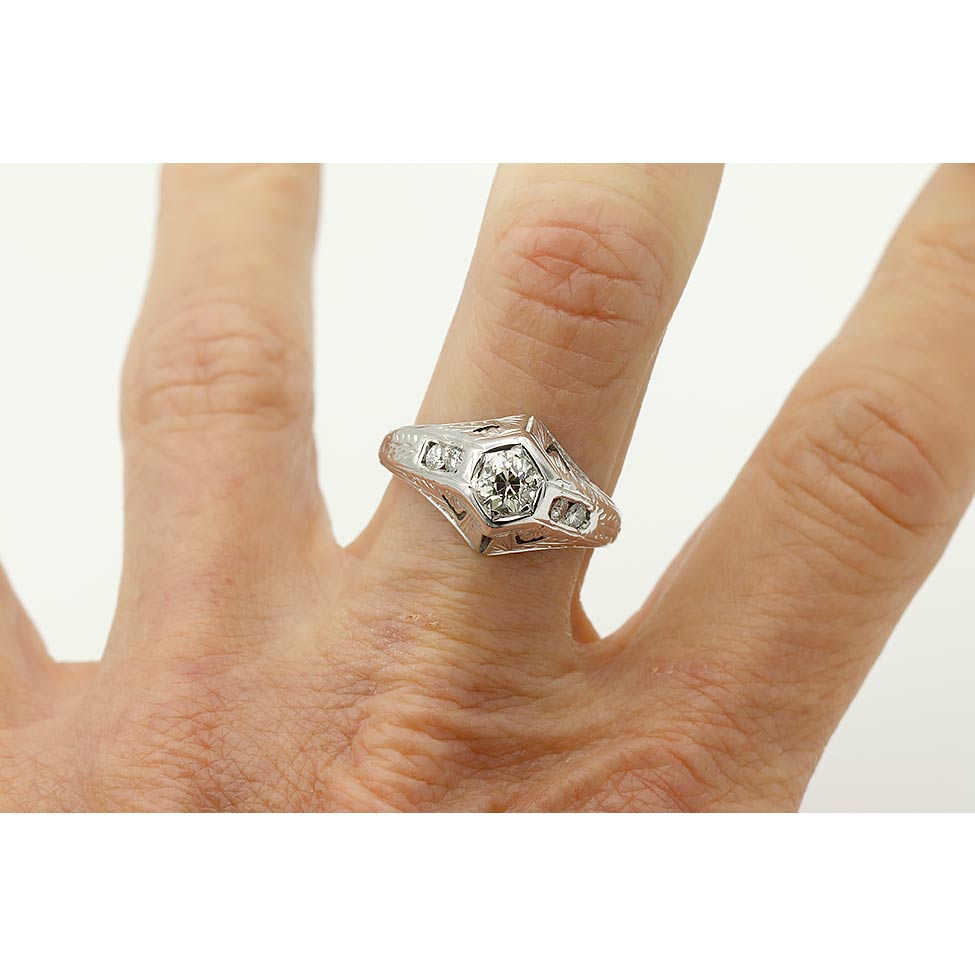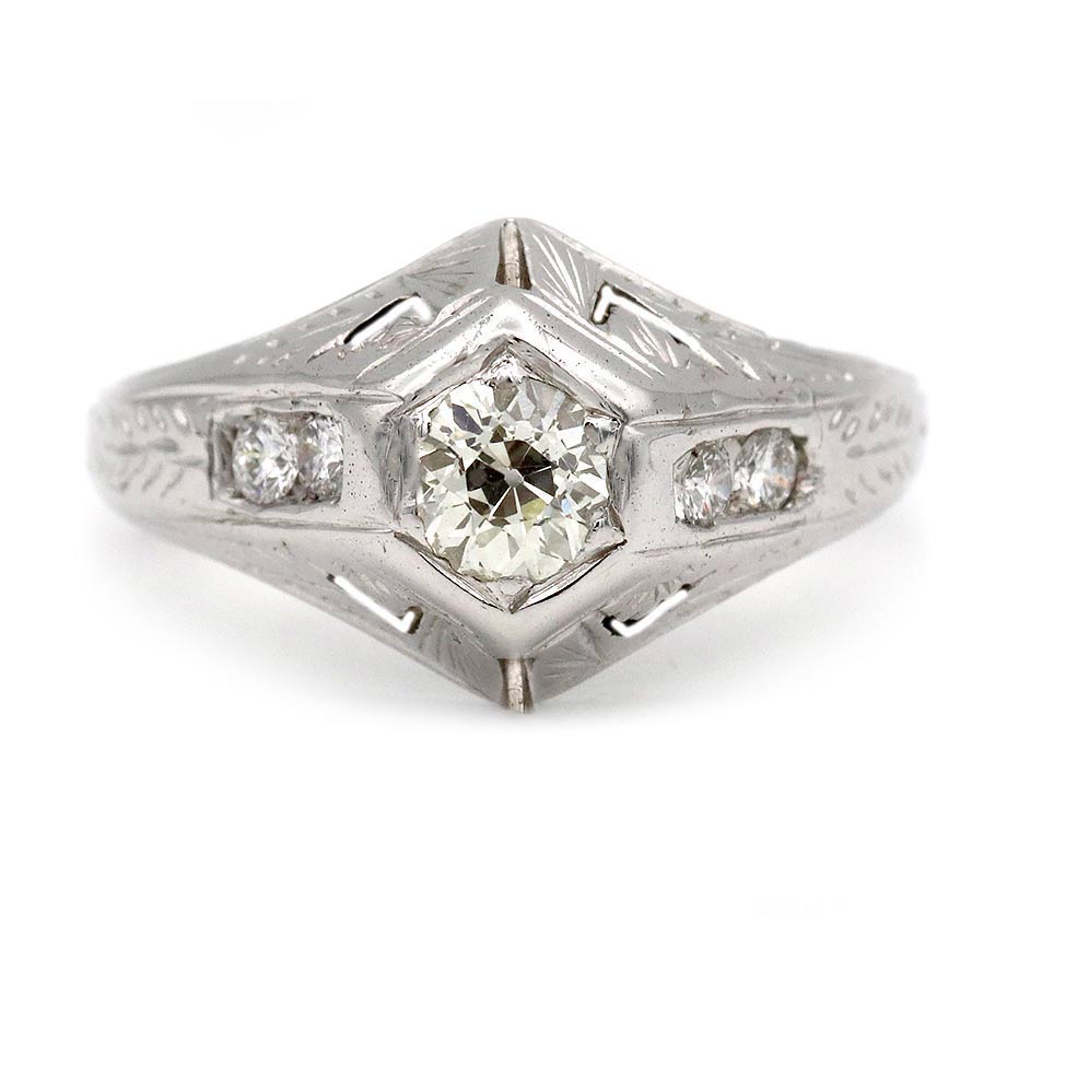 The Mika B ring is an authentic vintage diamond ring from the Art Deco era circa 1940's. The ring features a glittering AGI certified .50 carat old mine cut diamond of J color, VS2 clarity, residing in a geometric hexagonal frame. The diamond is flanked by 4 single cut diamond accents. Crafted in 14 karat white gold, completed with delicate filigree detailing. A cool, chic vintage piece with a touch of light patina. Perfect for either hand. In good condition.