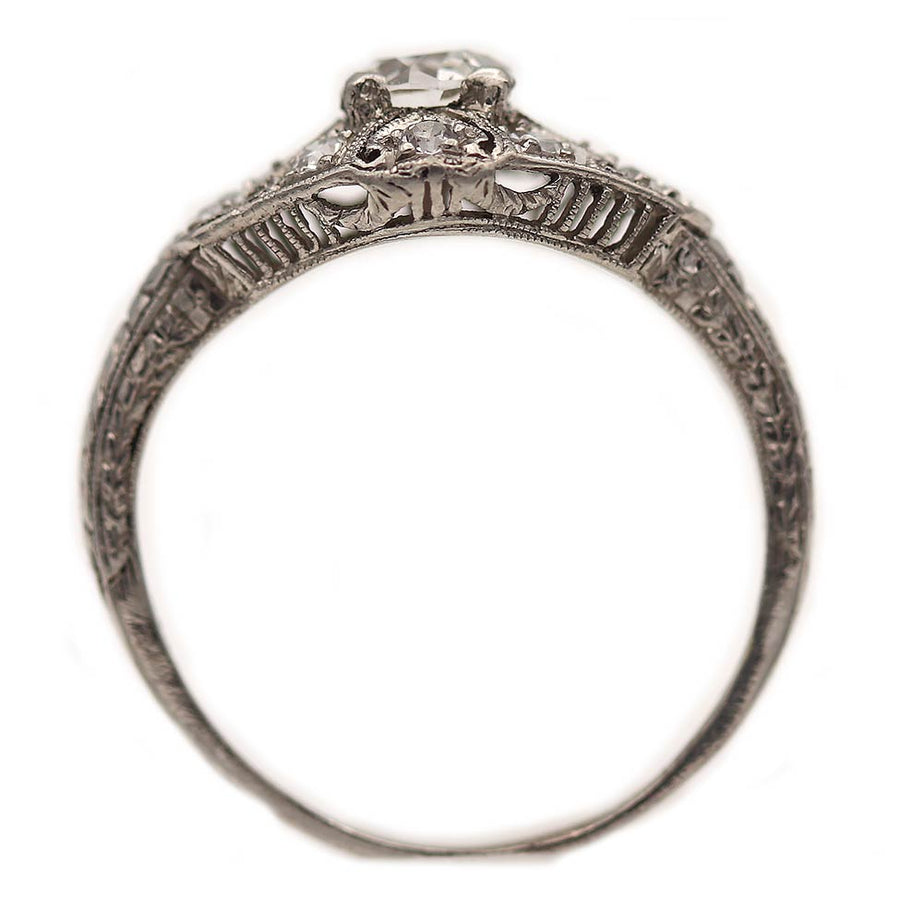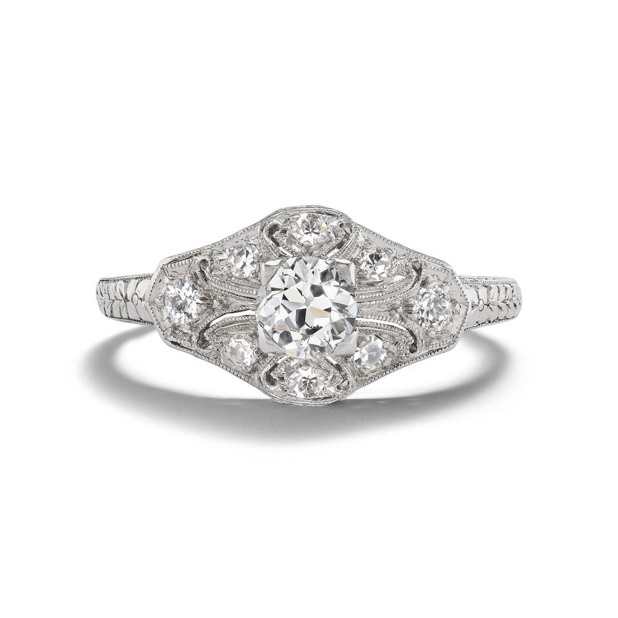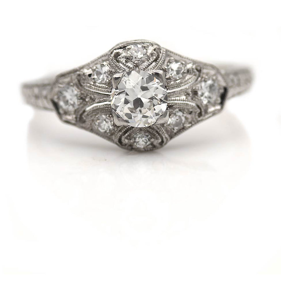The Junipera ring is an authentic vintage engagement ring from the Art Deco Era, circa 1930s. This ring showcases a glittering 0.40 carat old European cut diamond of F color and VS2 clarity, surrounded by 8 old European and single cut diamond accents. Beautifully crafted in platinum and accentuated with filigree and milgrain engravings. An Art Deco masterpiece, in excellent condition and very hard to find.