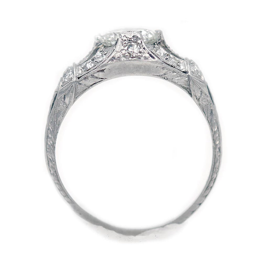 The Rosalind ring is an authentic vintage engagement ring from the Art Deco era circa 1930s. The ring features a 1.06 carat GIA certified old European-cut diamond of J color, SI2 clarity. The diamond is surrounded by 18 single cut diamond accents. Hand fabricated in platinum, accentuated with open metal work, milgrain and intricate filigree engravings. Rare, stunning and one of a kind! In excellent condition.