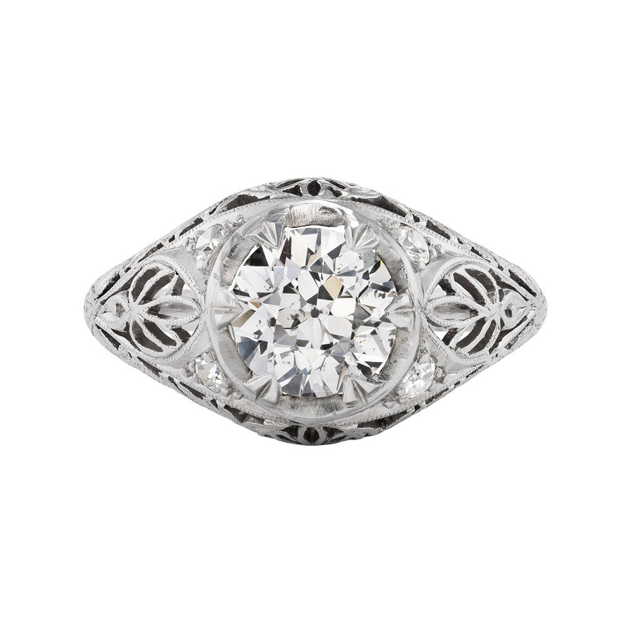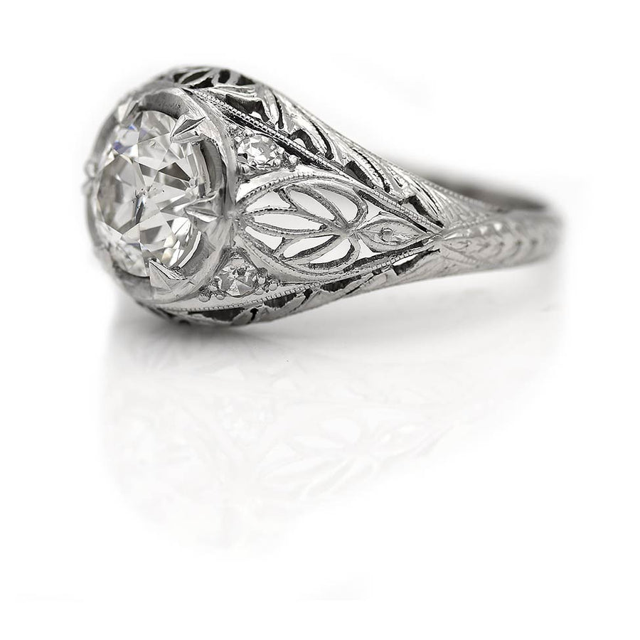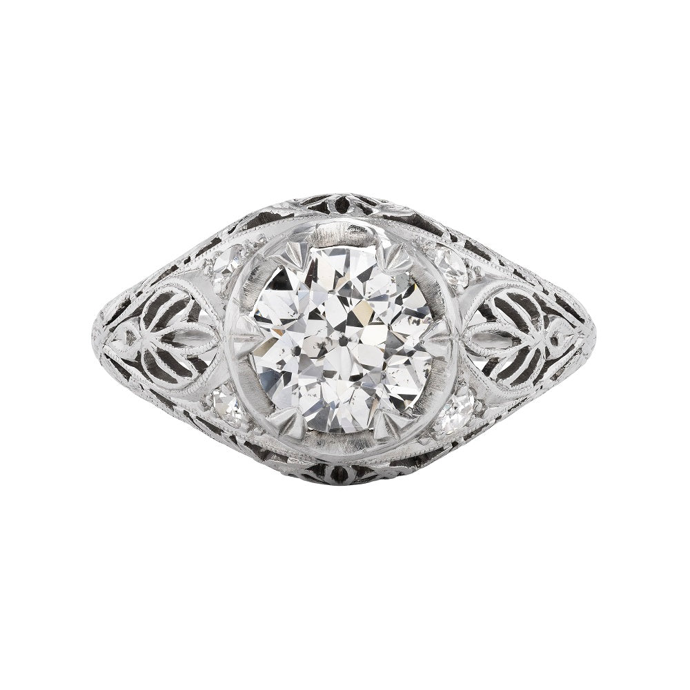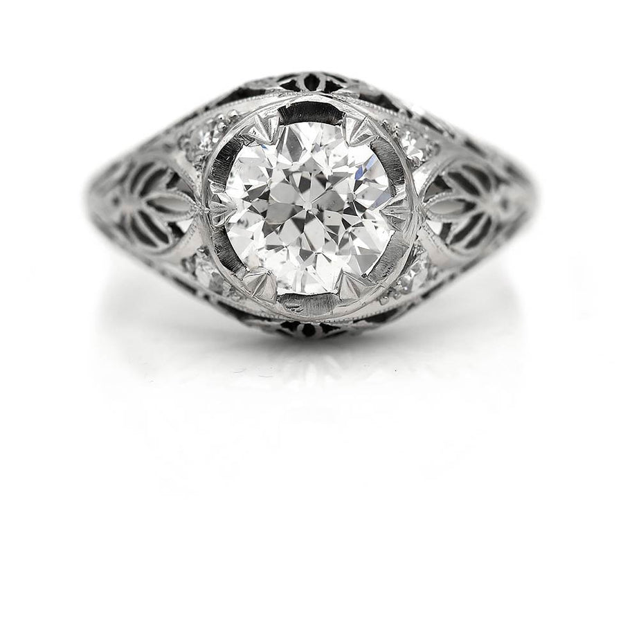 The Fannie B ring is an authentic vintage engagement ring from the Art Deco era, circa 1930's. This ring features a beaming 1.71 carat GIA certified old European cut diamond of J color and SI2 clarity, surrounded by 4 single cut diamond accents. Beautifully crafted in platinum, accentuated with beautiful open metal work and intricate milgrain engravings. A rare Art Deco treasure, in very good condition.